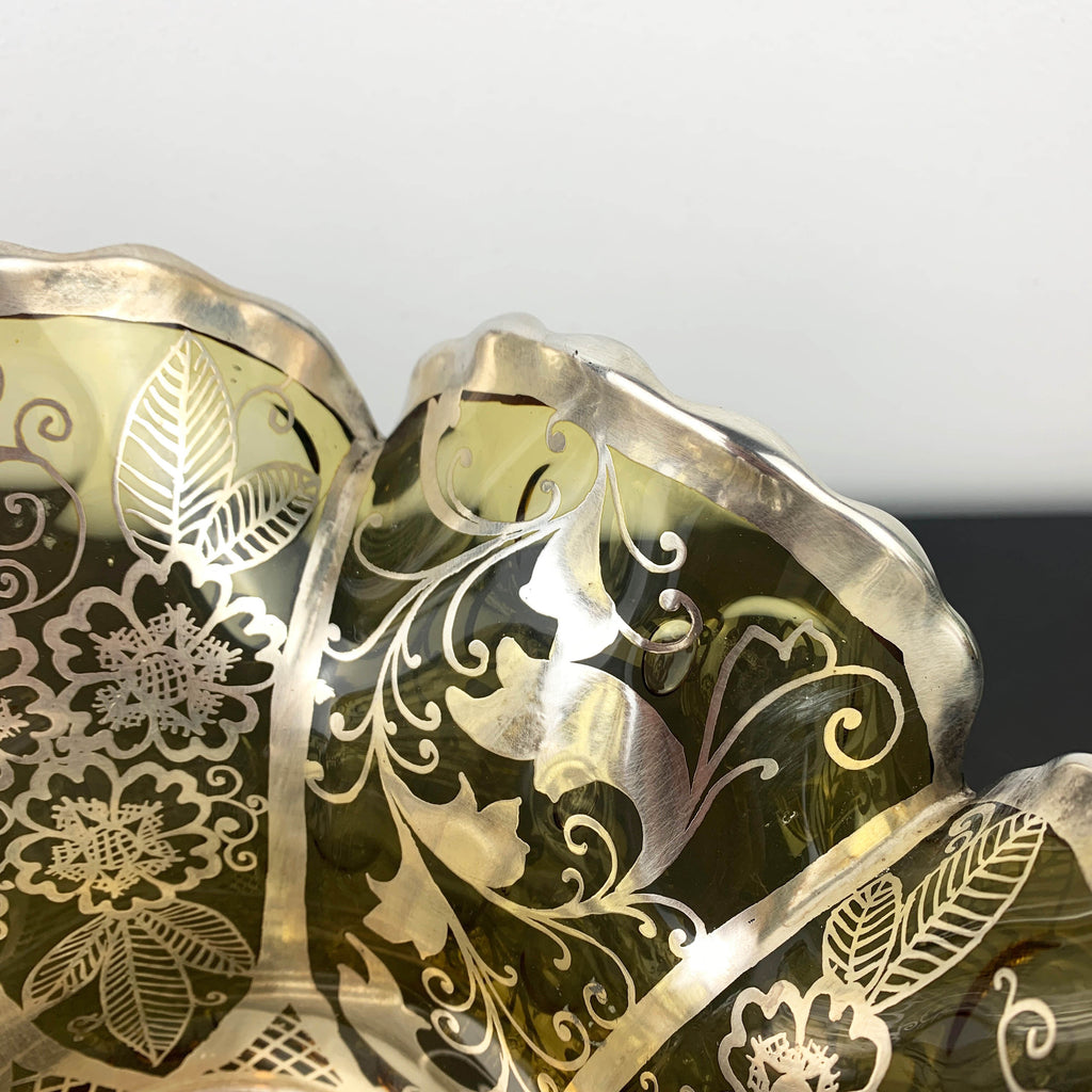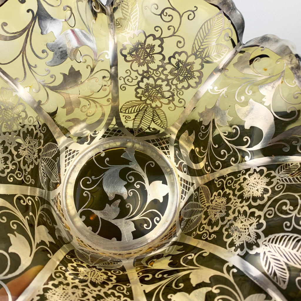 This elegant vintage bowl features stunning silver deposit work applied to the interior surface of rich amber or golden-yellow glass. With ruffled or 'handkerchief' style top rim with an ornate, flowing leaf and flower pattern.