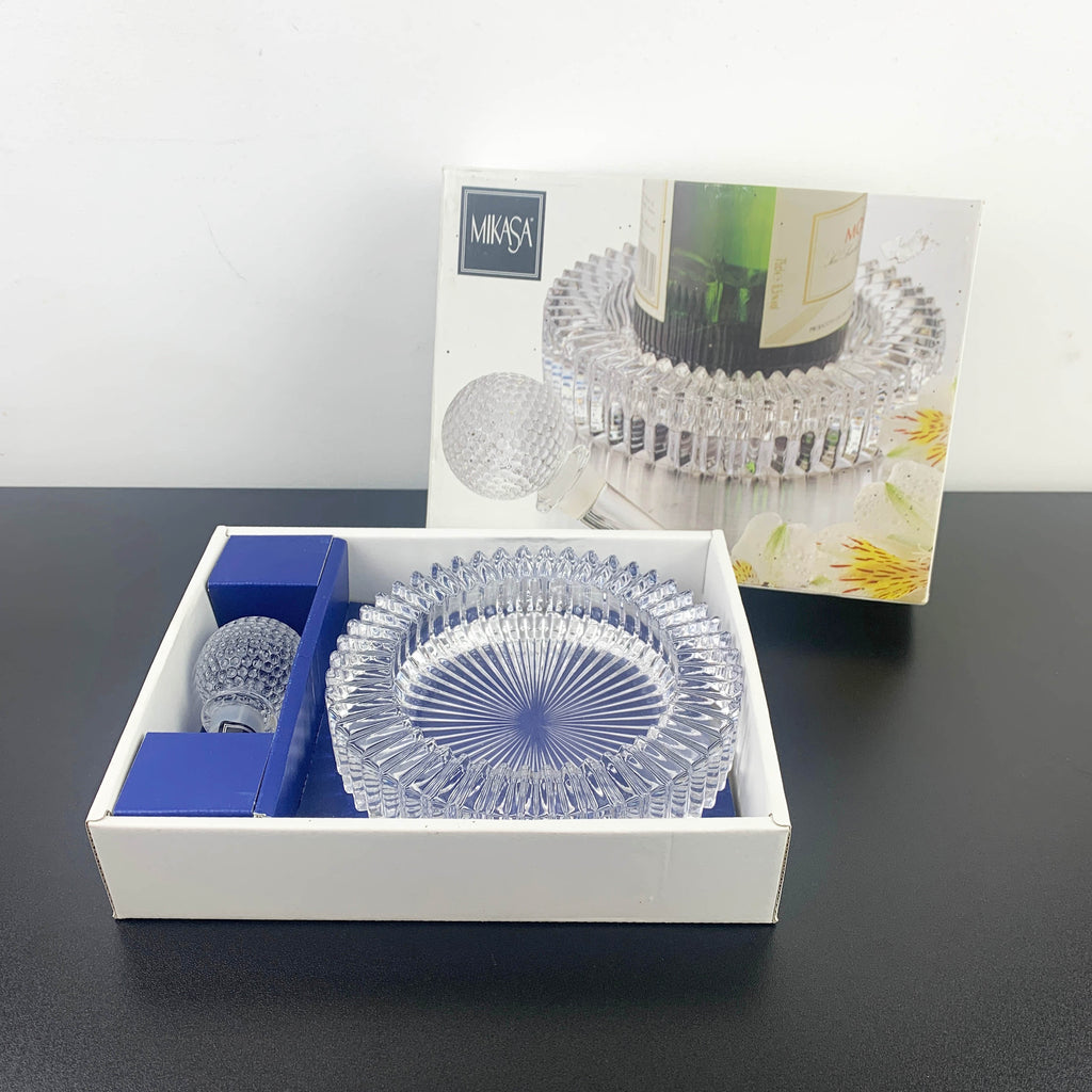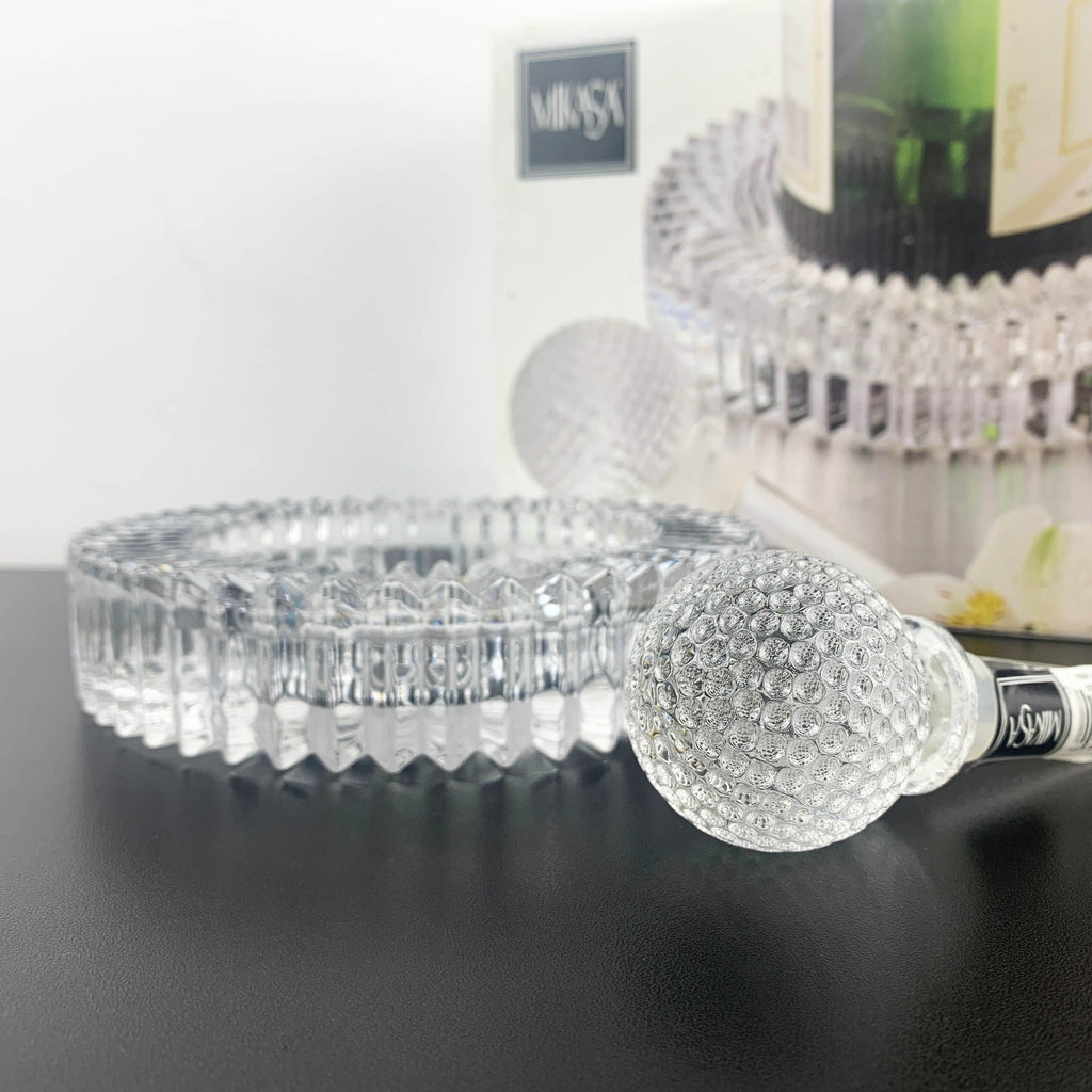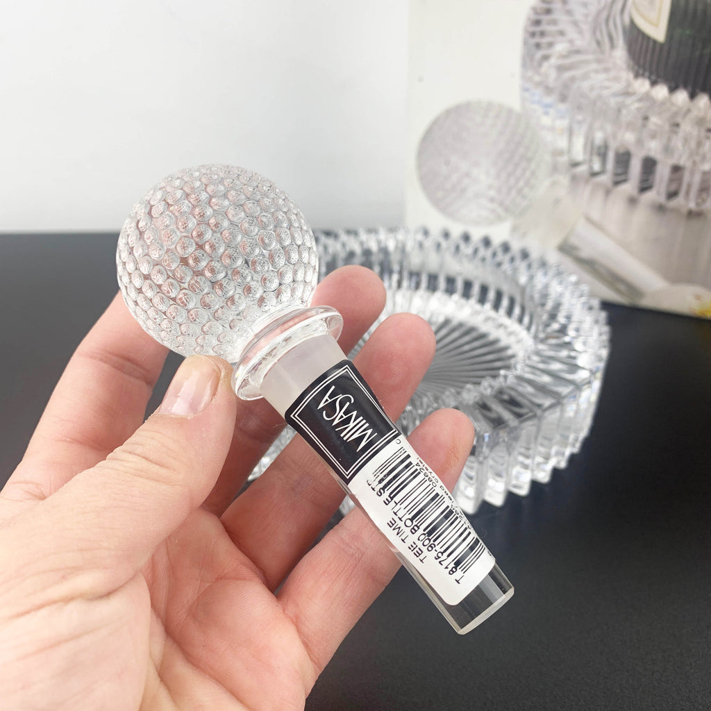 These pieces are very heavy, thick glass and beautiful quality. They are as new, in excellent condition and would suit even the most modern home. Includes a bottle coaster and wine stopper in the shape of a golf ball. The bottle coaster can be used as a decorative ashtray or nut bowl, it is a versatile crystal bar or table piece.