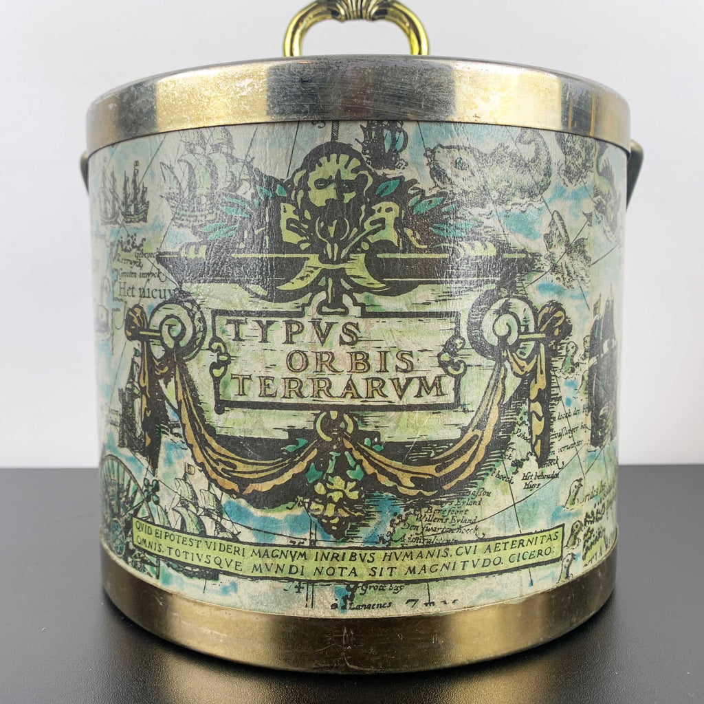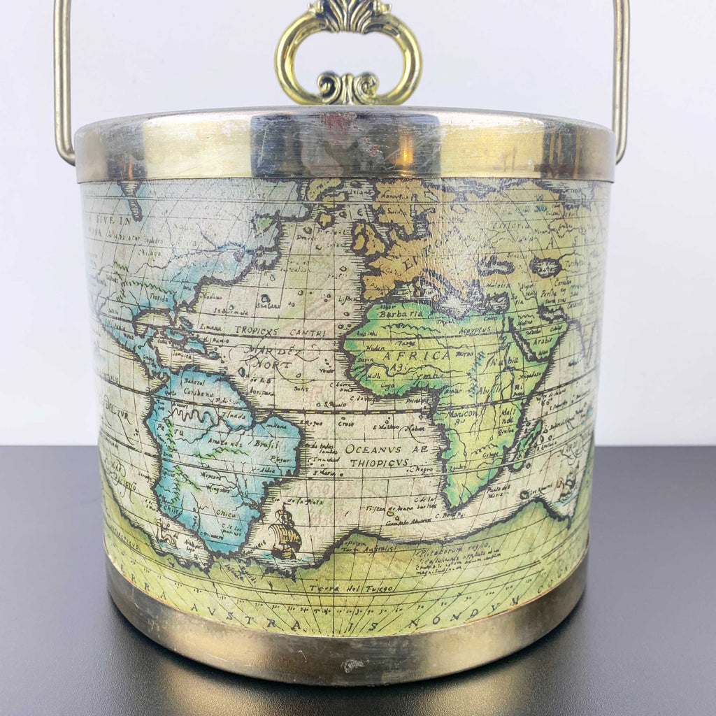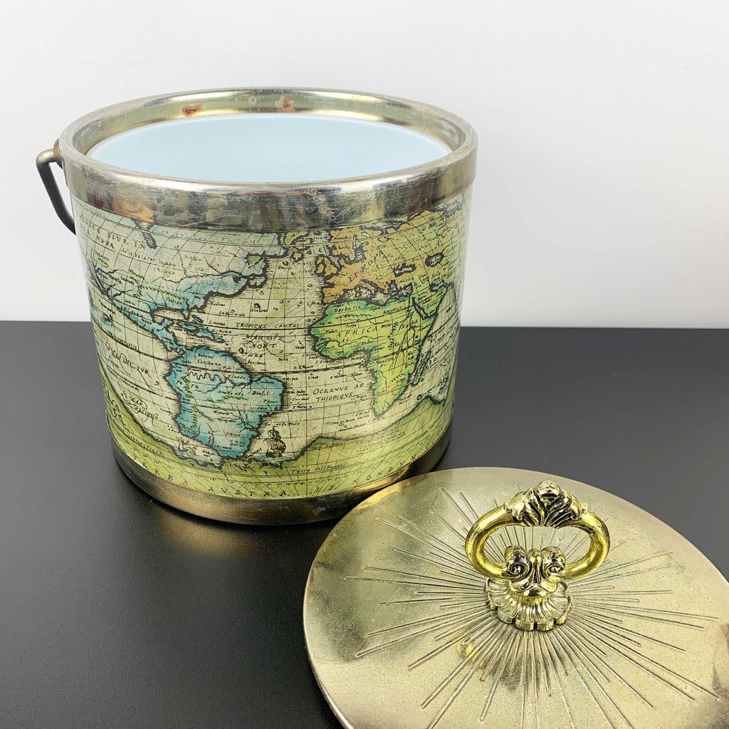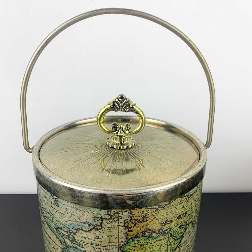 With metal handle and white plastic interior, it is a nice large (diameter) ice bucket and would look fantastic on a bar cart or gifted to a home bar enthusiast and vintage lover. The metal banding and lid have age related wear and tarnish, but in overall good vintage condition. The knob is plastic, quite common for ice buckets of this era. A wonderful unique ice bucket with a renowned map exterior.