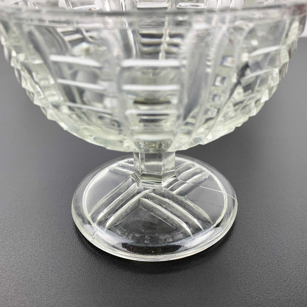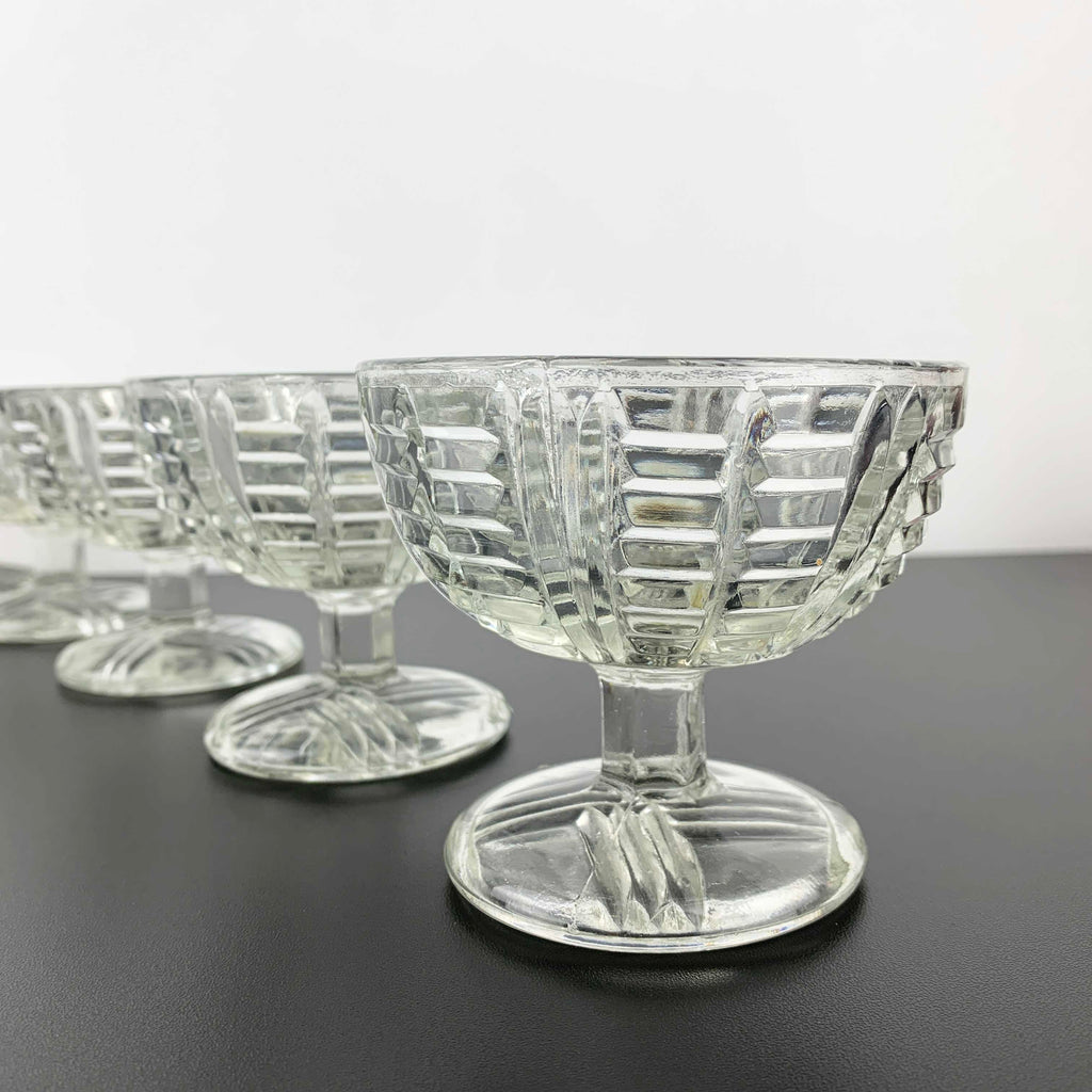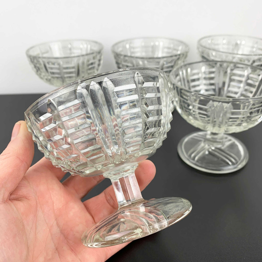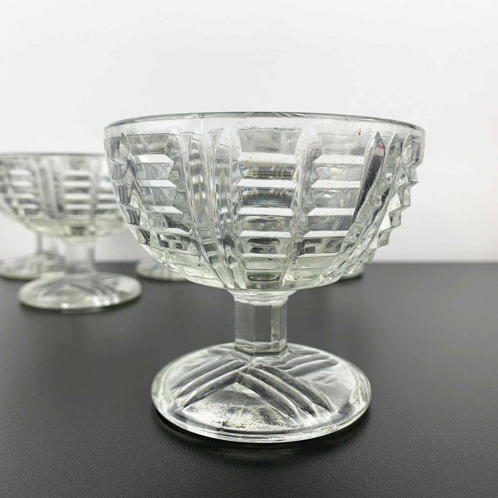 Each bowl features a sturdy footed base with cross hatch pattern and a beautiful ladder style design to the exterior bowl. Very tactile pieces in an art deco or early 20th century style. Designed with both style and durability in mind, this set is perfect for everyday use or special occasion desserts. Possible EAPG, though no maker reference has been located. These are thick and quality glass bowls.