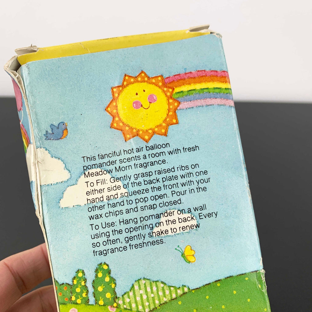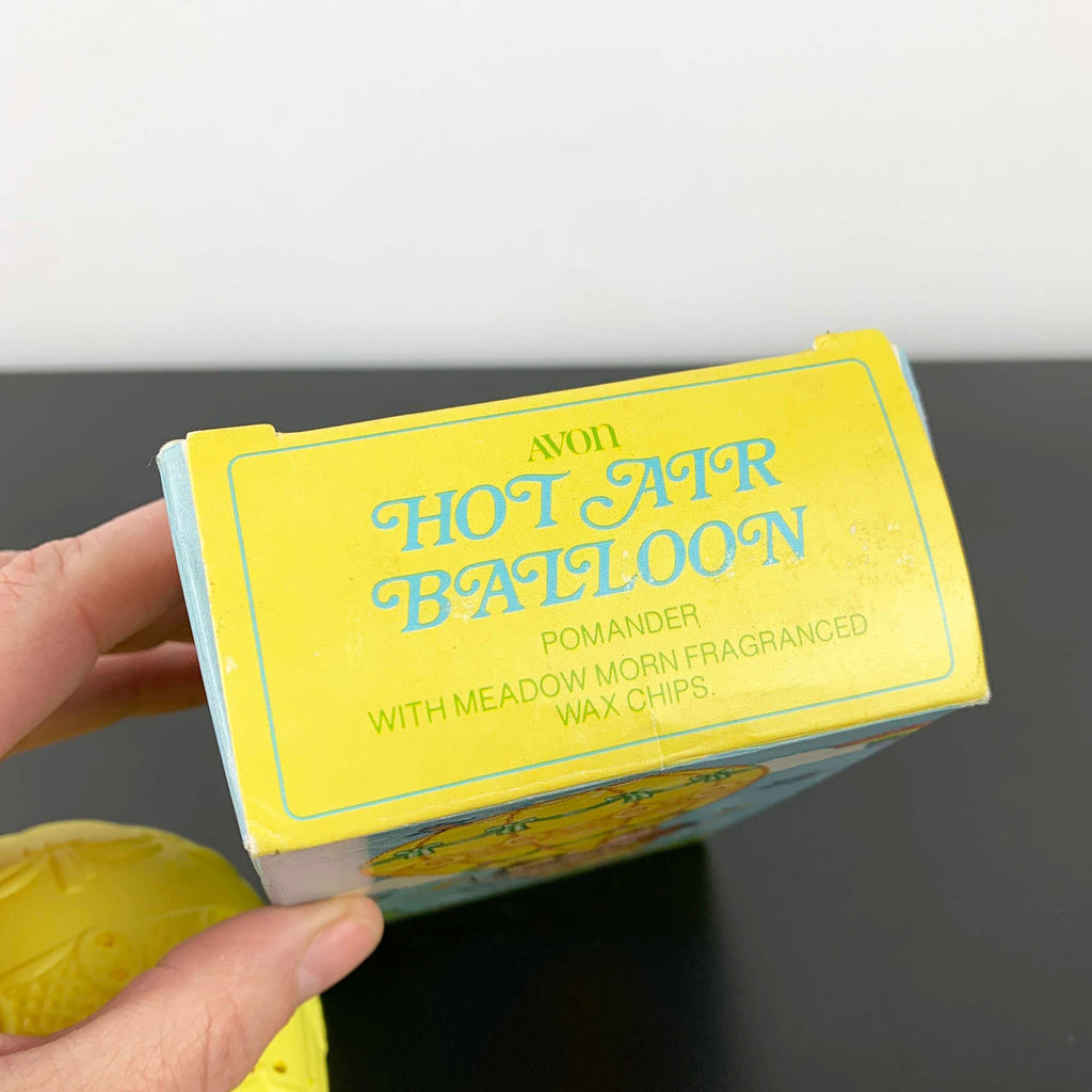 Avon collectible wall pomander, Hot Air Balloon in bright yellow. As new, in original box. Pomander does not contain the original wax chips but can be used with others. Hanging notch on rear.