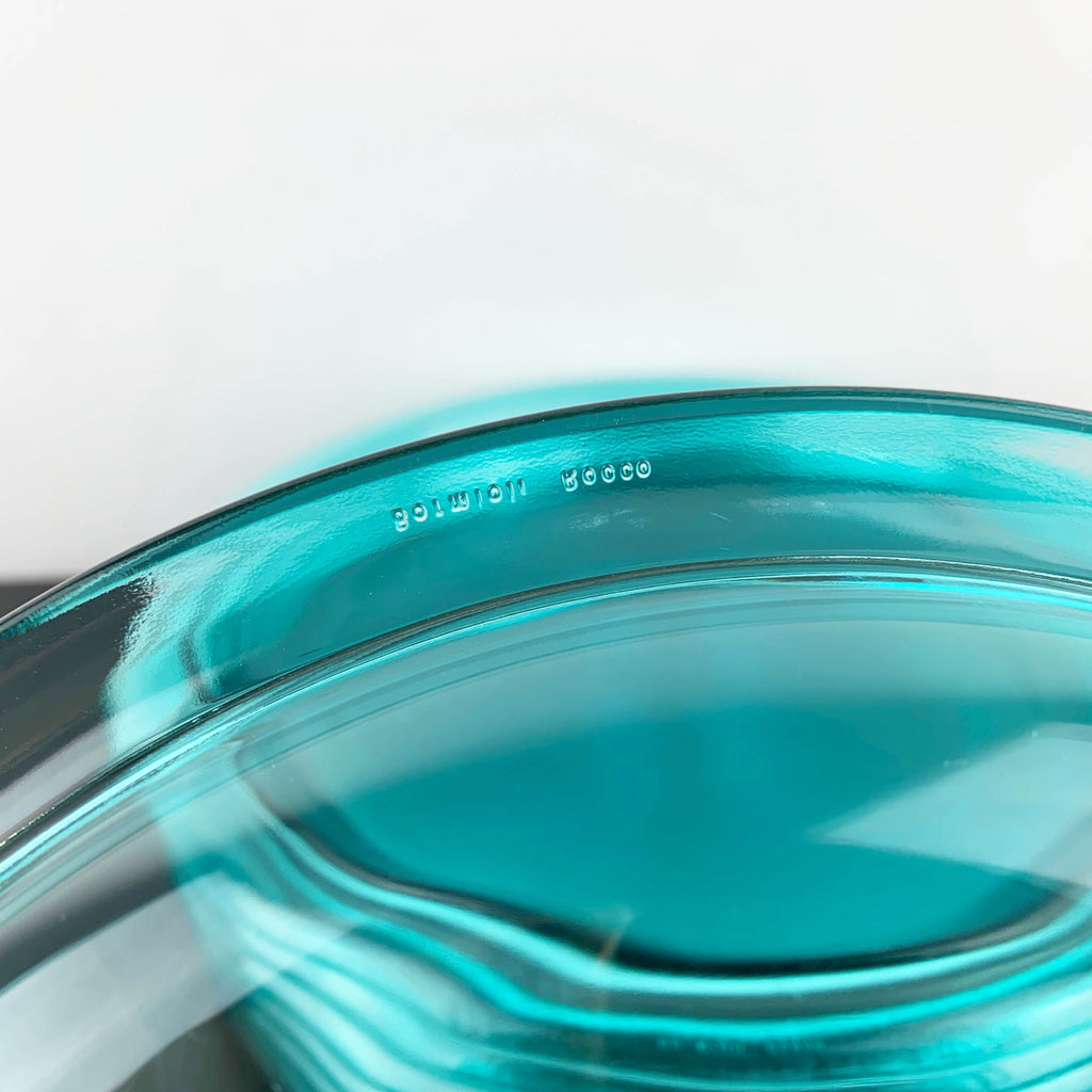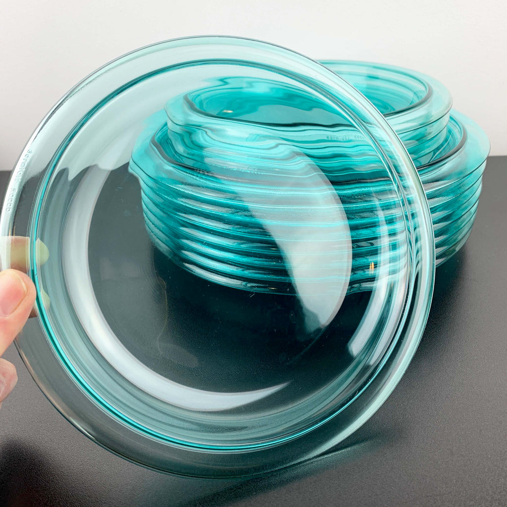Stylish vintage glass dinnerware by Bormioli Rocco, Italy. These are the Vitrosax range of durable, tempered glass tableware, produced primarily in the 1970's and 1980's. These sets are in the popular Aquamarine Blue colour.
