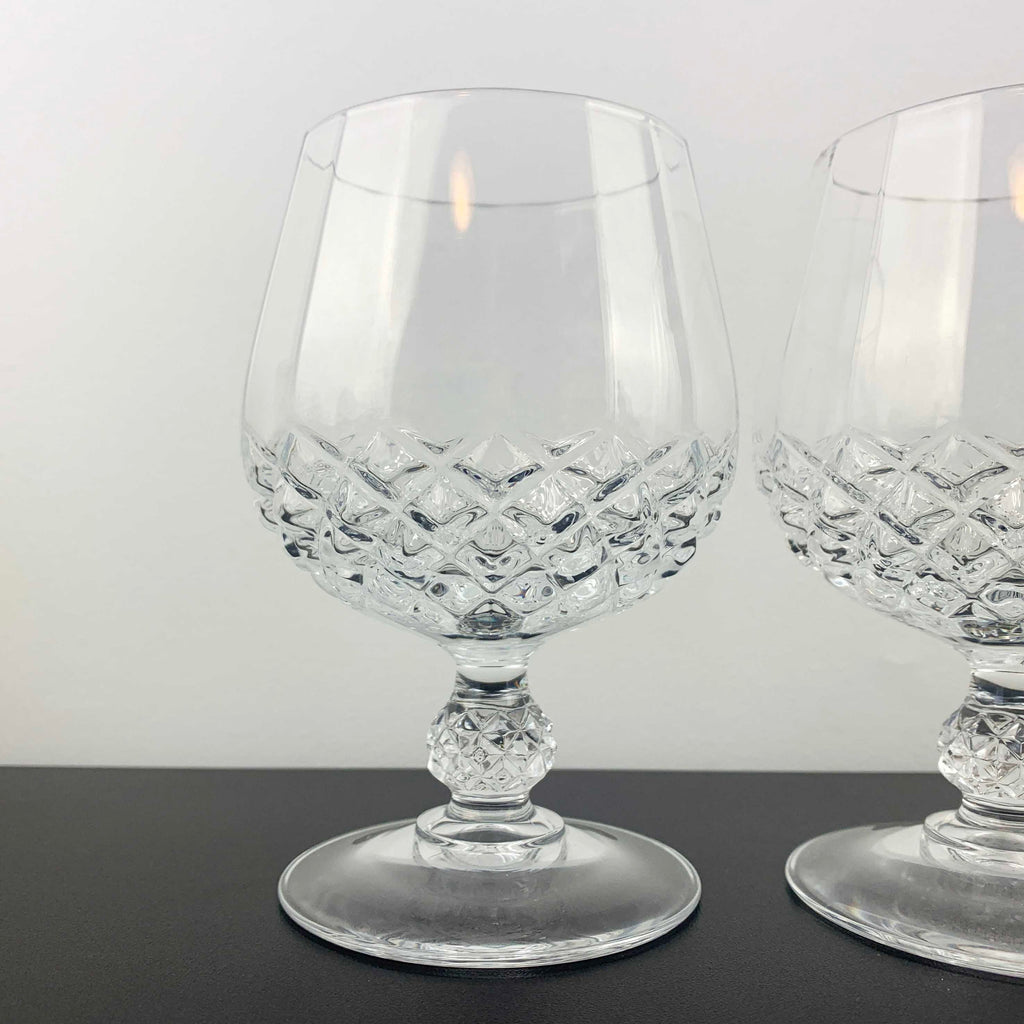 Beautiful French lead crystal glasses for brandy, cognac or cocktails. Popular Longchamp design, elegant glassware for the dinner table, home bar or events. Design produced in 1978.