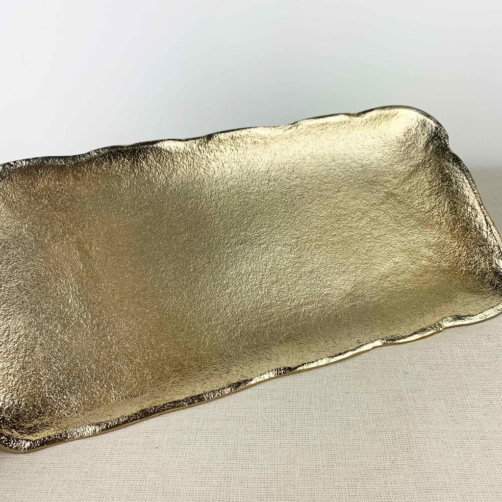 A gold decor tray in rectangular form with a sculptural undulating edge.