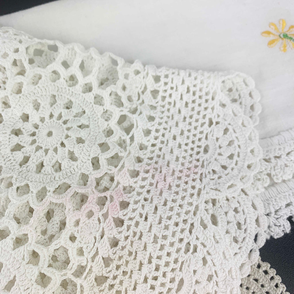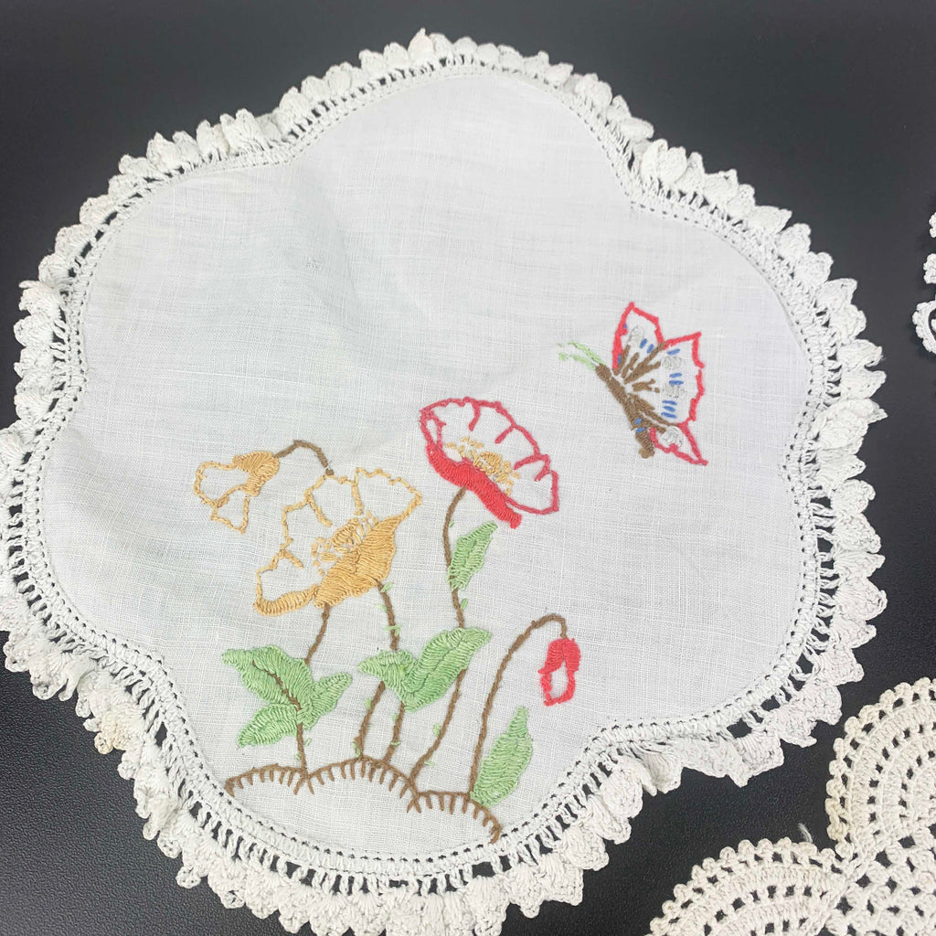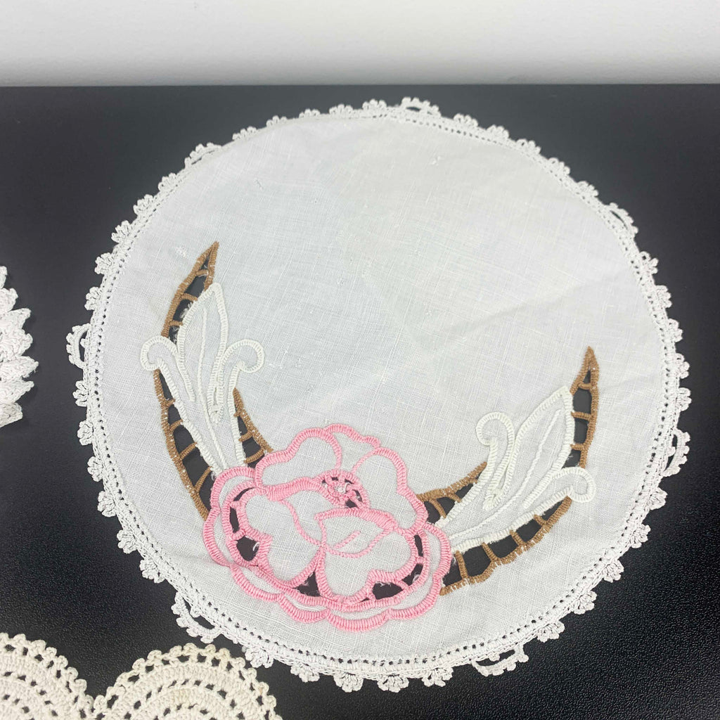 A set of vintage white crotcheted and embroidered doyleys, set of 5.
