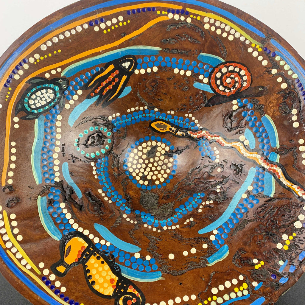 Australia Aboriginal art hand painted Eucalypt wood pedestal bowl
