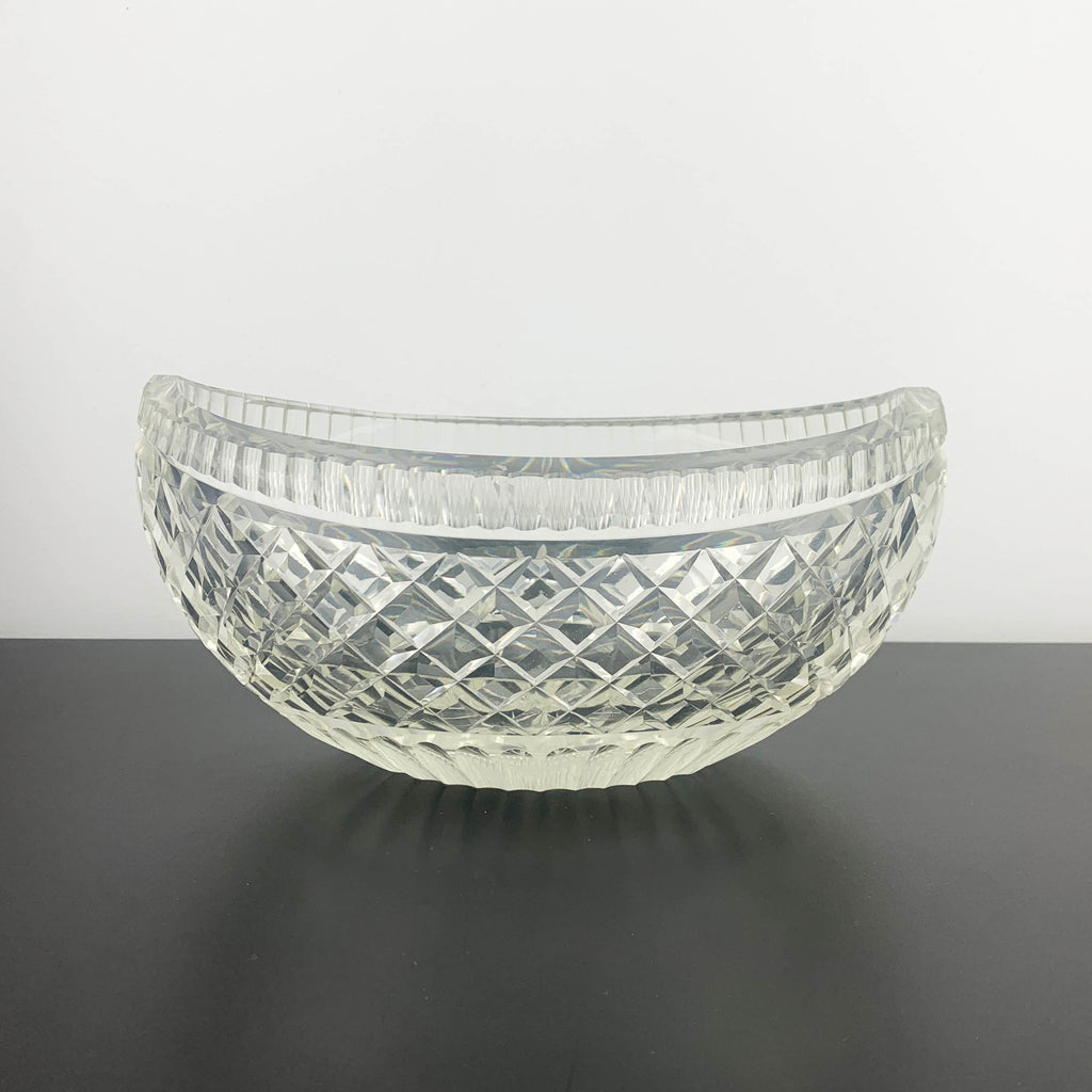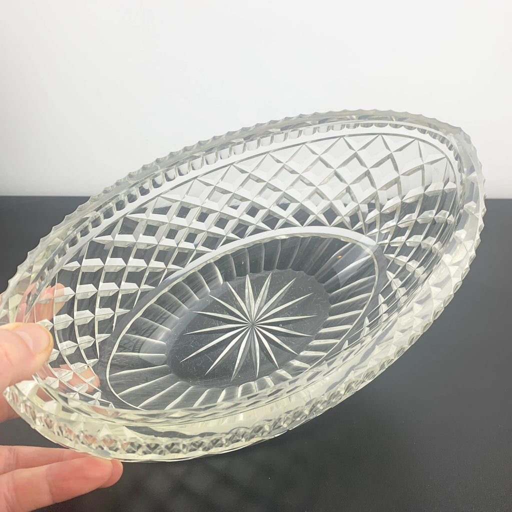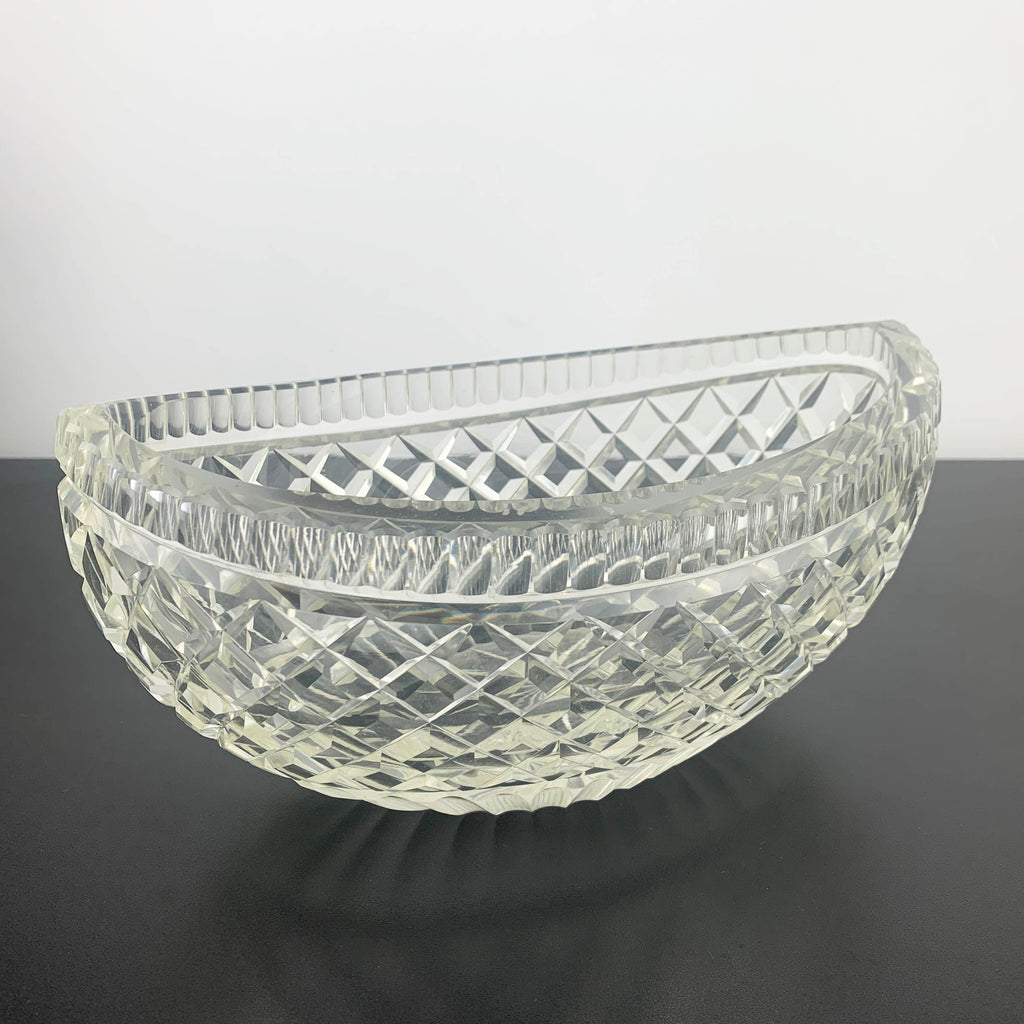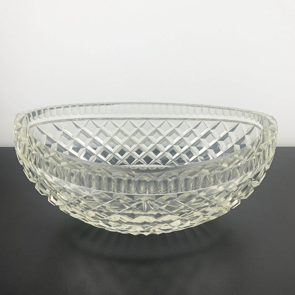 This heavy oval bowl features a traditional diamond cut design to the body, with a detailed thumbprint cut to the exterior top rim and base adding an extra layer of design detail which adds to the beauty of the piece.
