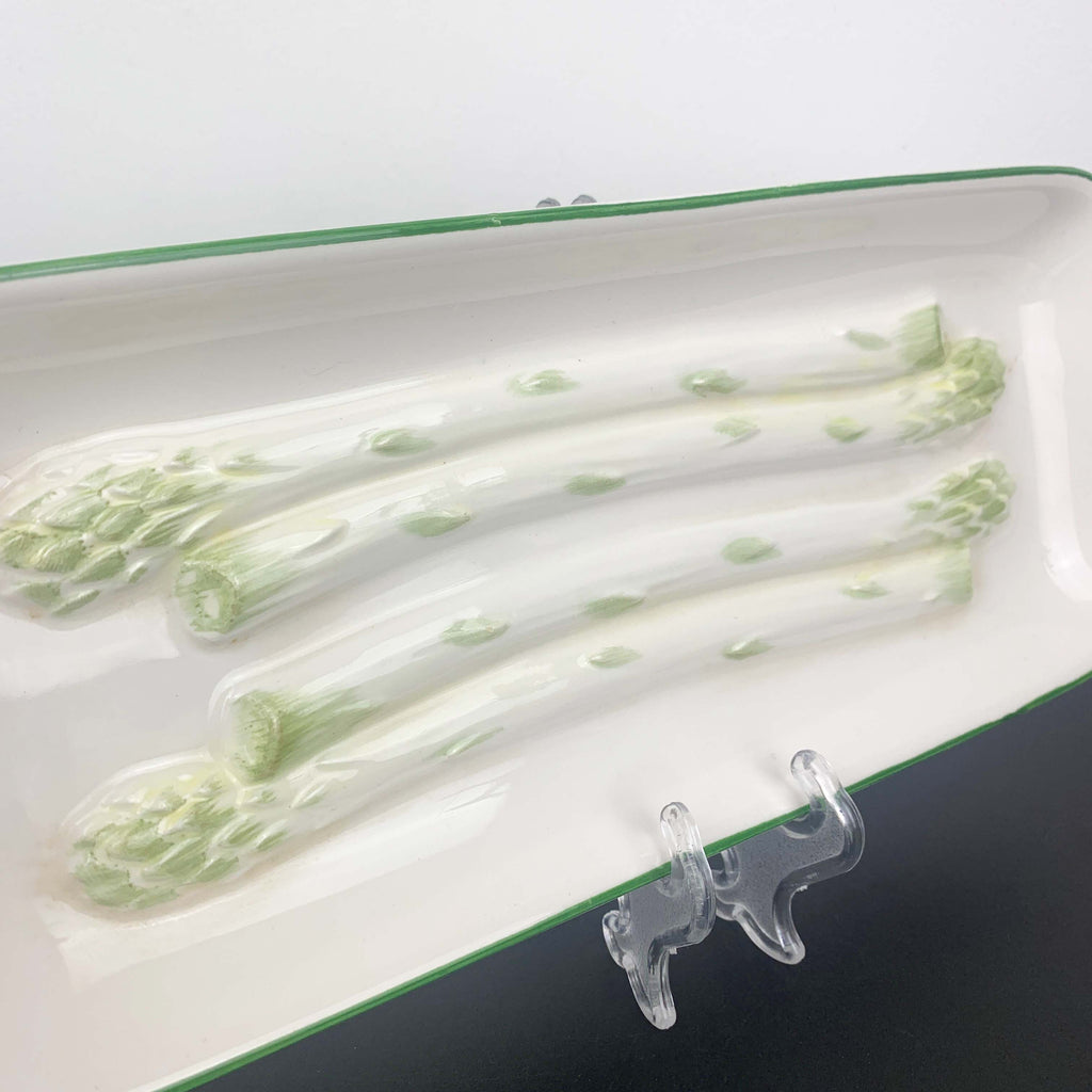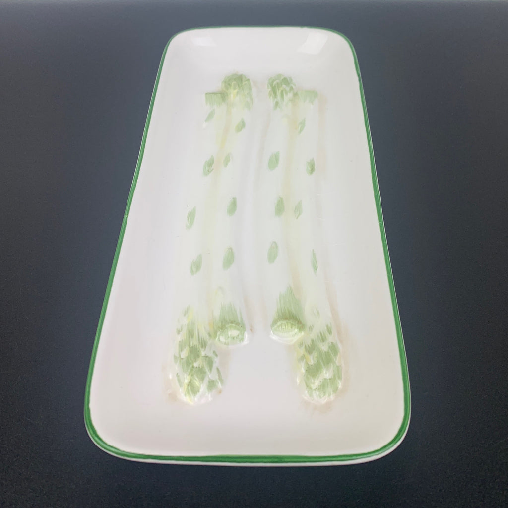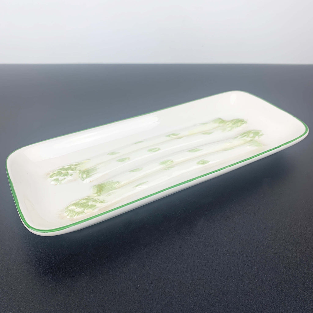 This beautiful unique asparagus serving plate has an attractive hand painted majolica style design with relief moulded asparagus and painted green rim.