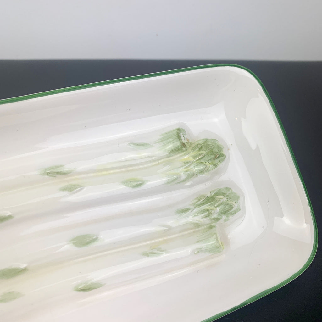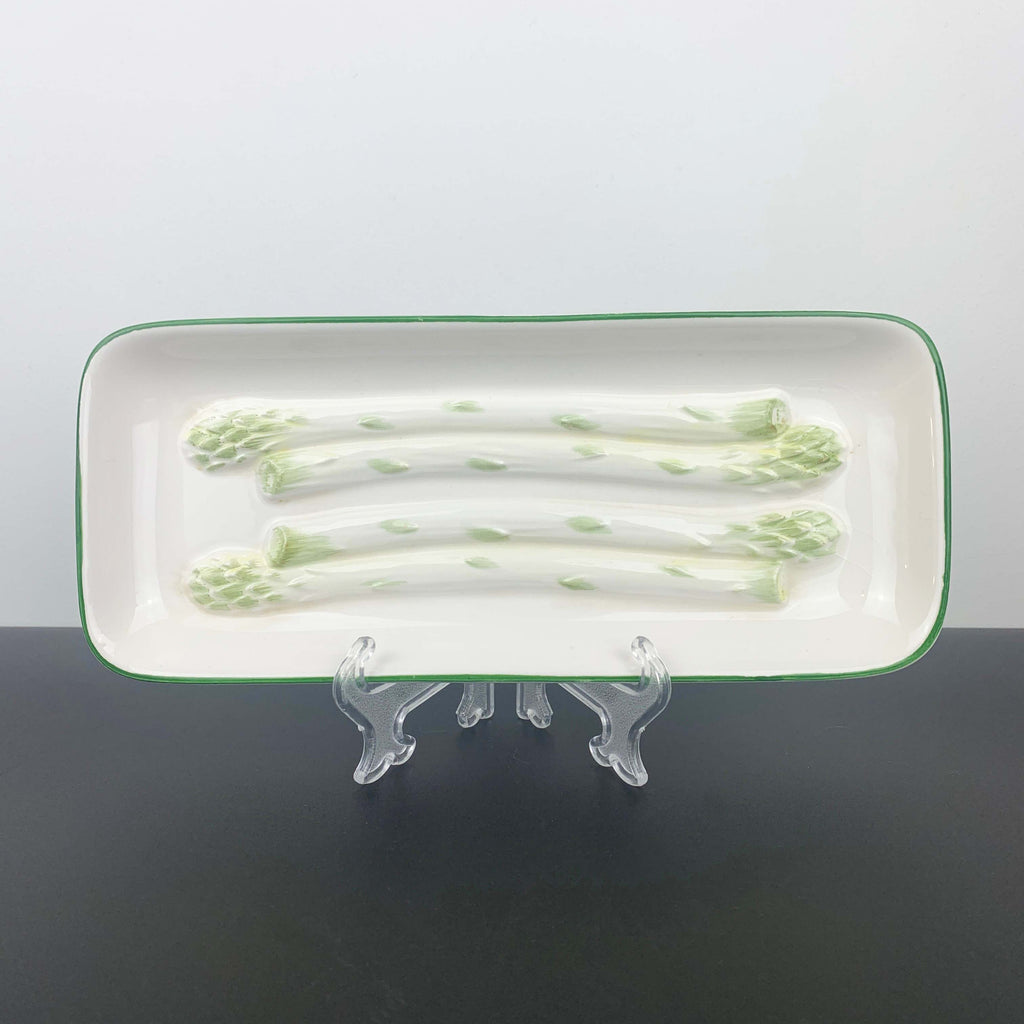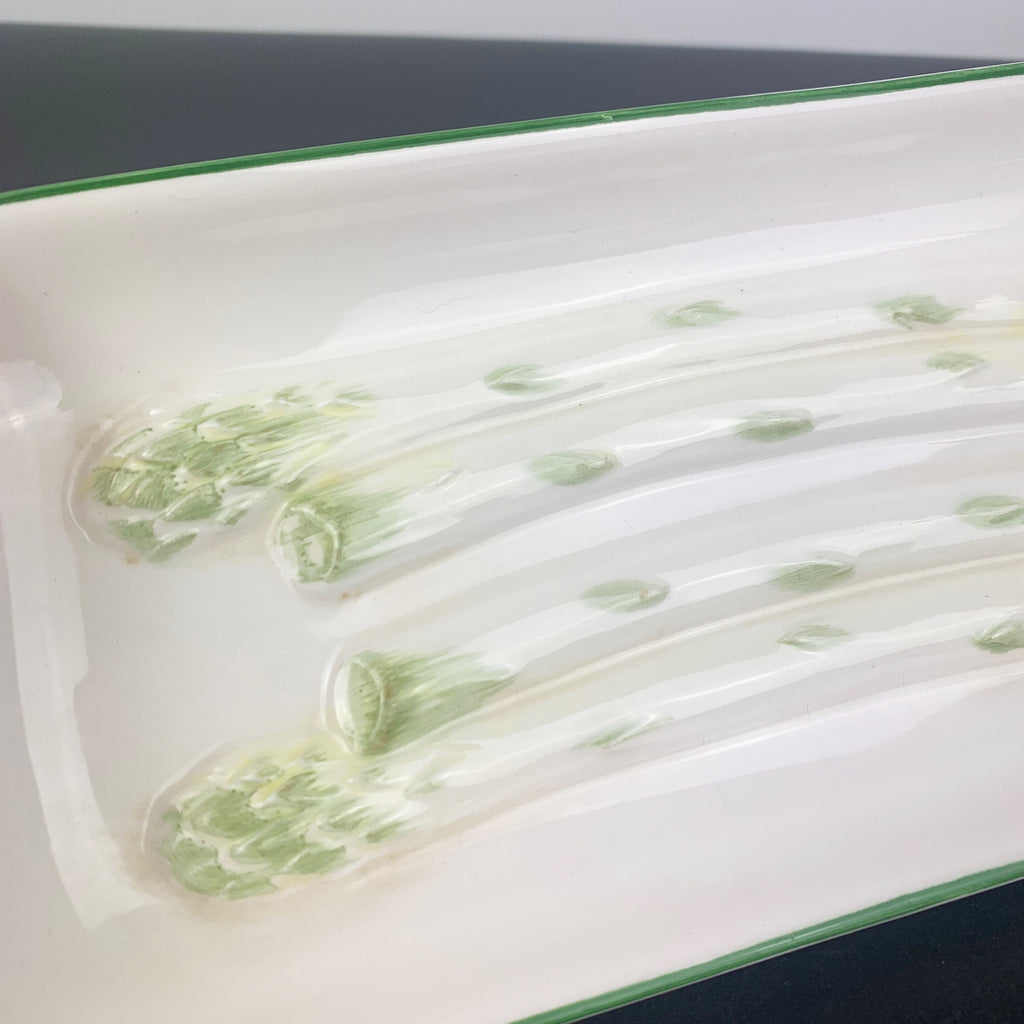 This beautiful unique asparagus serving plate has an attractive hand painted majolica style design with relief moulded asparagus and painted green rim.