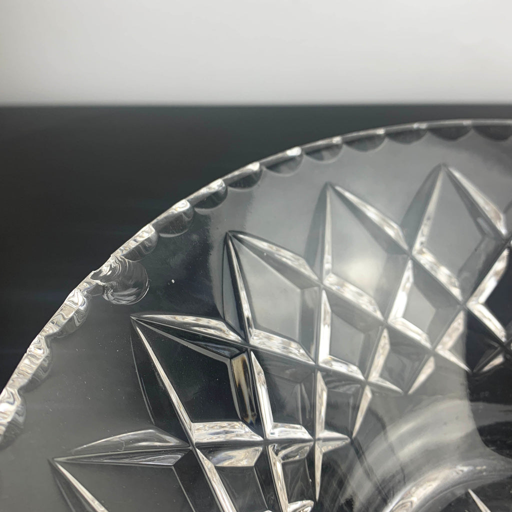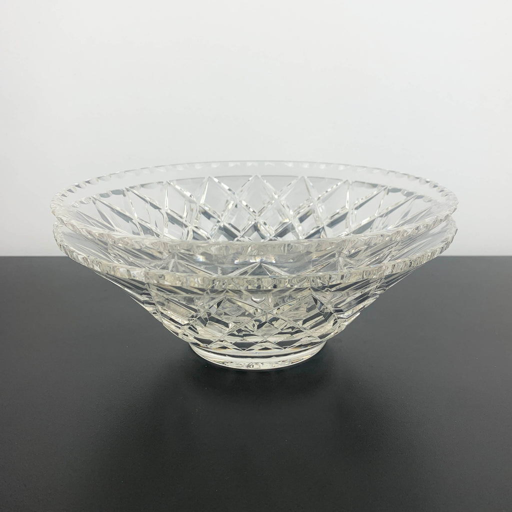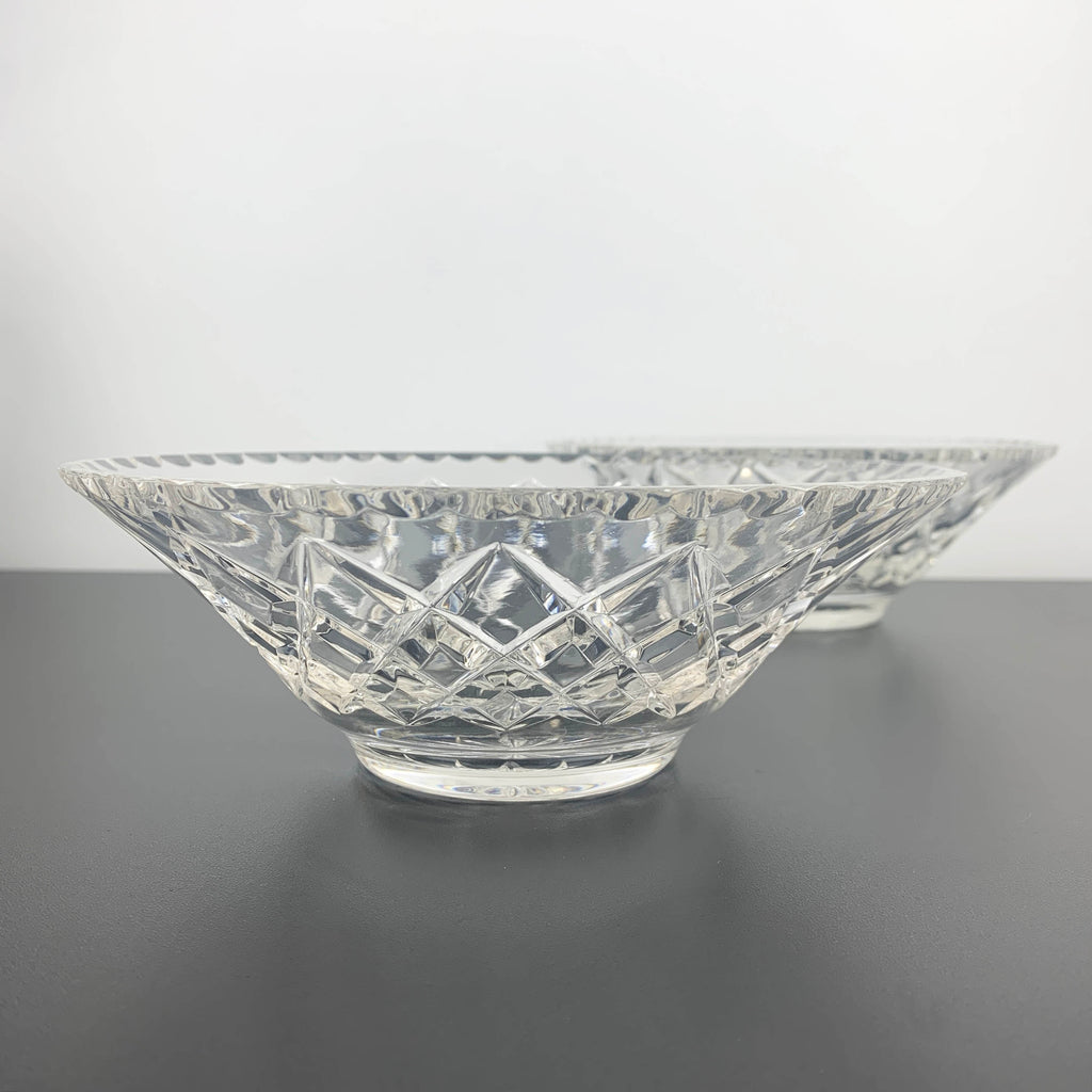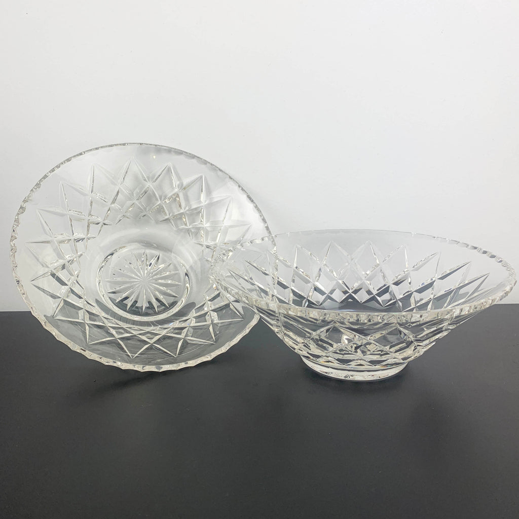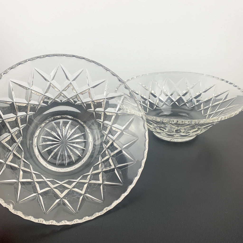 These bowls are the same size, sold as a pair. They have a traditional diamond cut pattern and scalloped edge. Both a flared style shallow bowl, medium size, suitable as a decorative bowl, flower bowl or additional serving bowls for a table.
