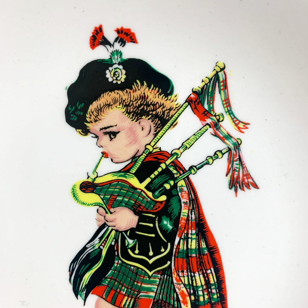 This is a lovely souvenir style featuring a little boy dressed in traditional Scottish clothing, playing the bagpipes with the words 'Frae Bonnie Scotland'.