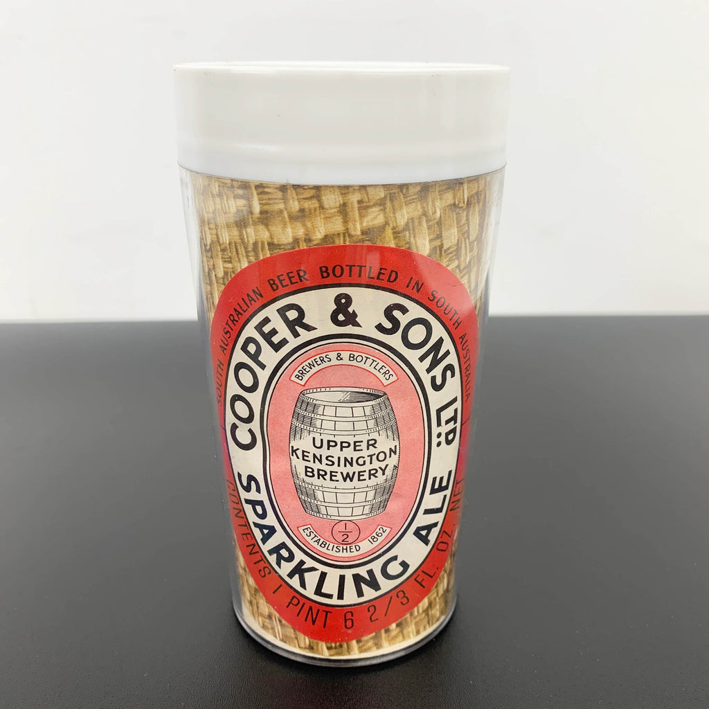 One tumbler has VB (Victoria Bitter) on one side, and Melbourne Bitter on the other side. The second tumbler has Cooper & Sons Sparkling Ale on one side, Cooper & Sons Best Extra Stout on the other side.