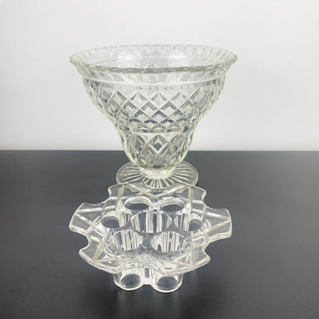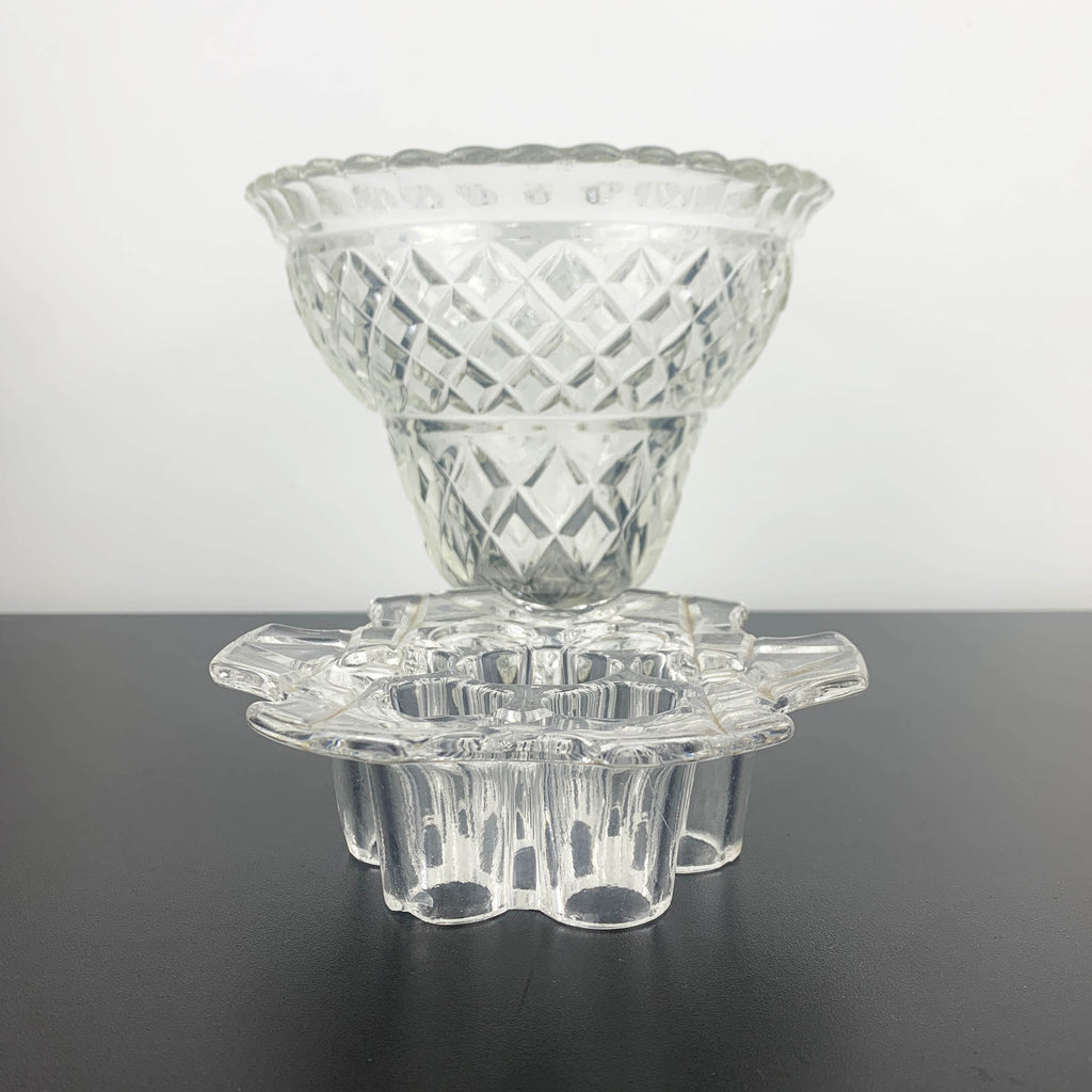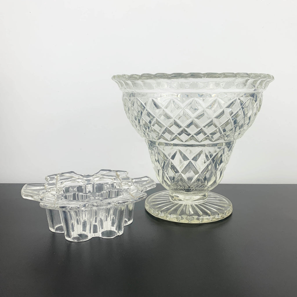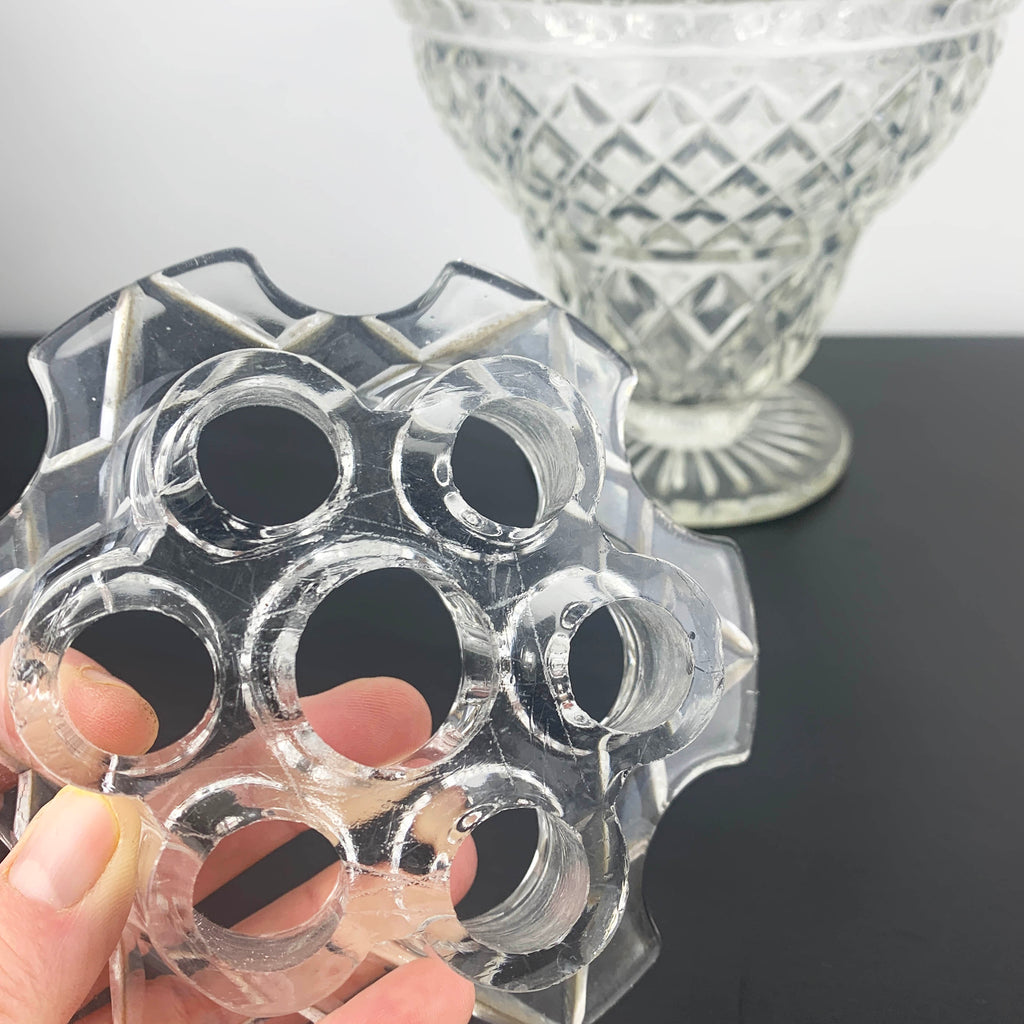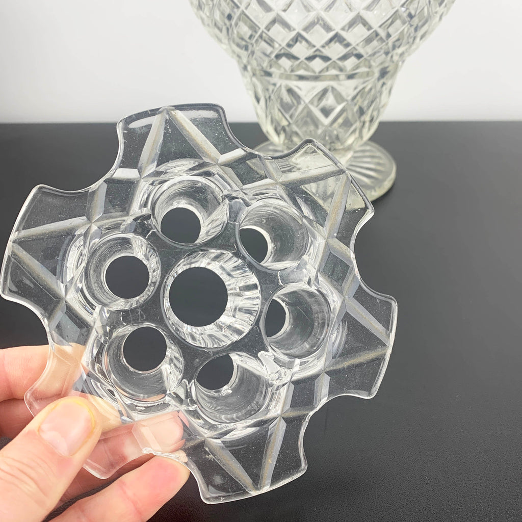 Vintage depression glass vase with flower frog (or stem holder), Crown Crystal, Australia. Circa 1930's.
