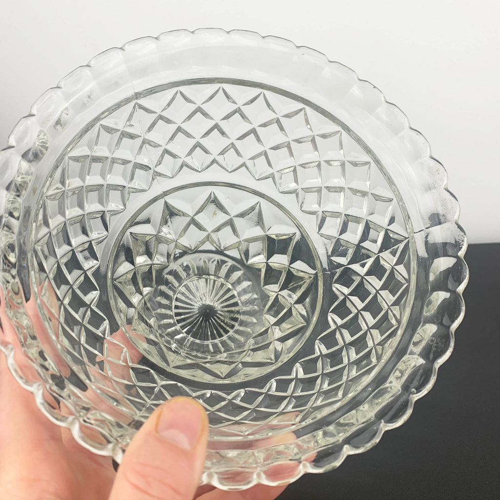 This pressed glass vase features a traditional diamond pattern on upper and lower bands with star pattern footed base and finished with a pretty frill top rim. It comes complete with flower frog.