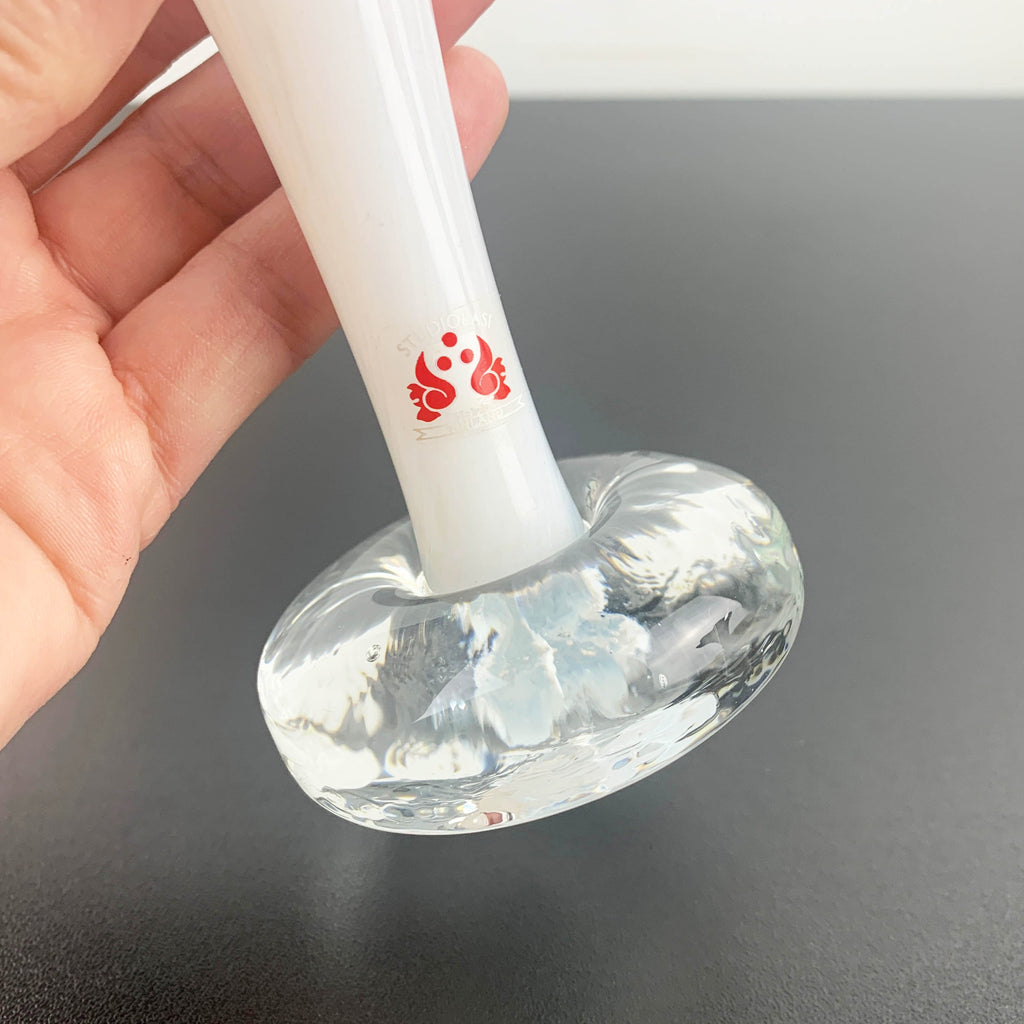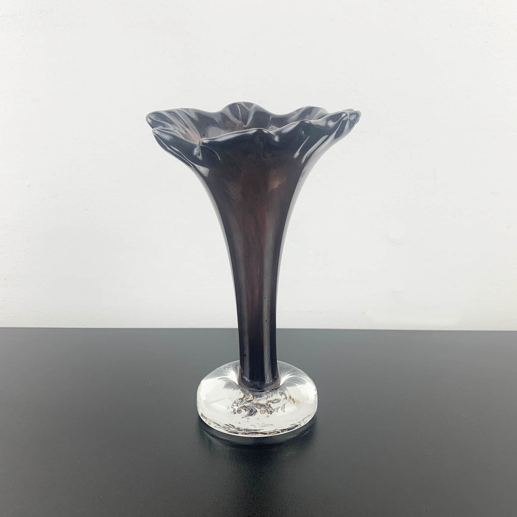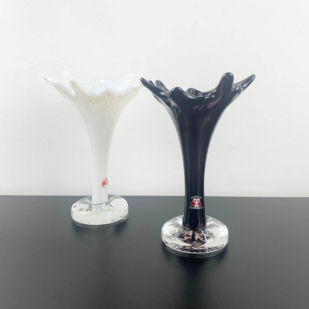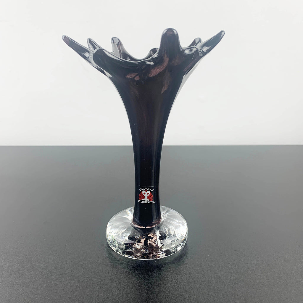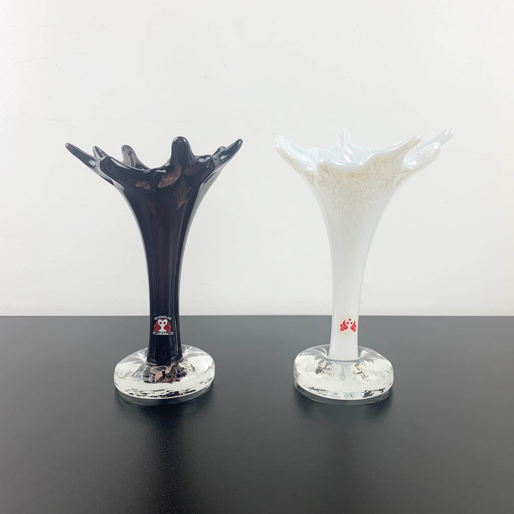 These organic style vases have a narrow base that widens into a flared, irregular opening at the top, resembling a stylised flower. The vases have a clear glass base, with original label. Studiolasi was a smaller or less well-known design studio in Finland producing art glass, late mid century. They are a beautiful work of art displayed on their own, or with a small bunch or floral stem.