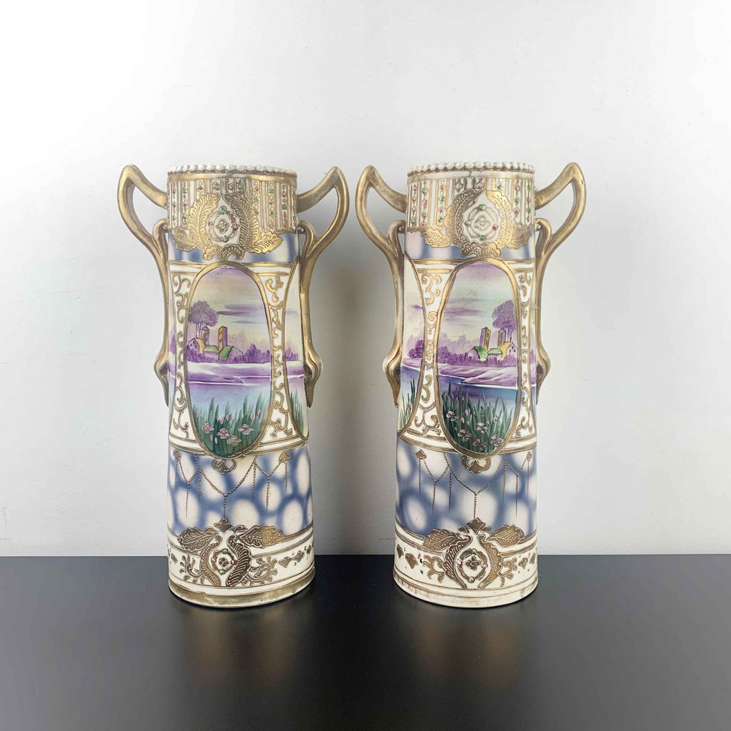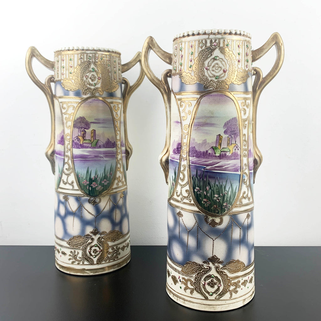 Hand painted antique Nippon art nouveau twin vases with landscape scene, circa 1910. Sold as a pair (set of 2).