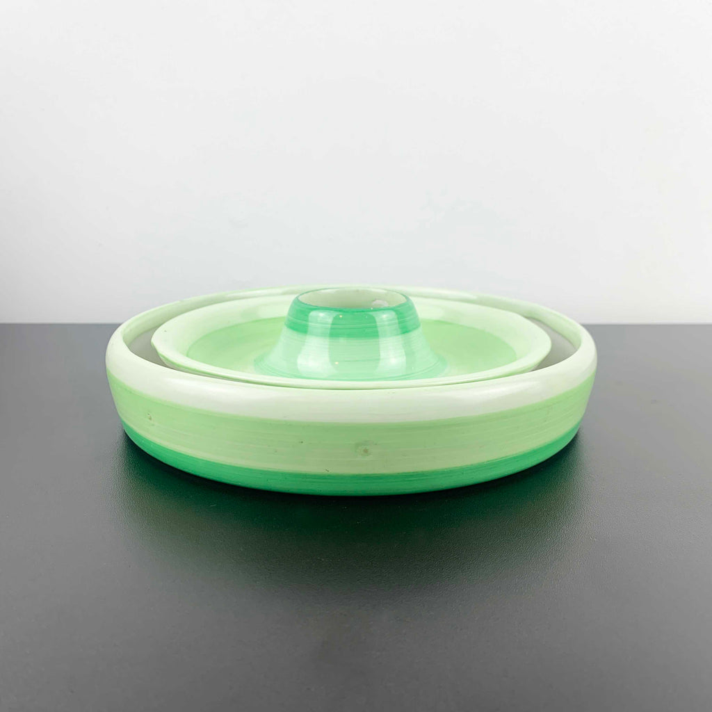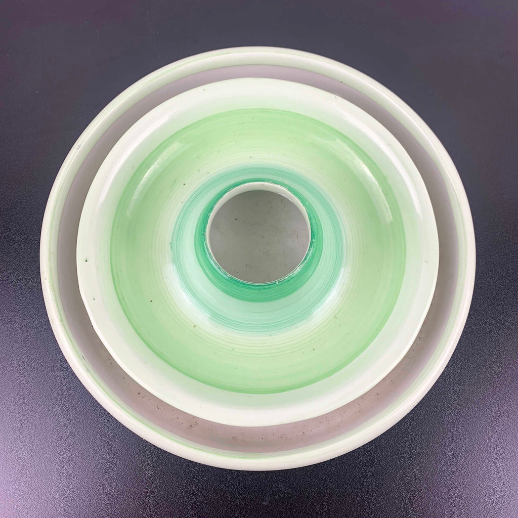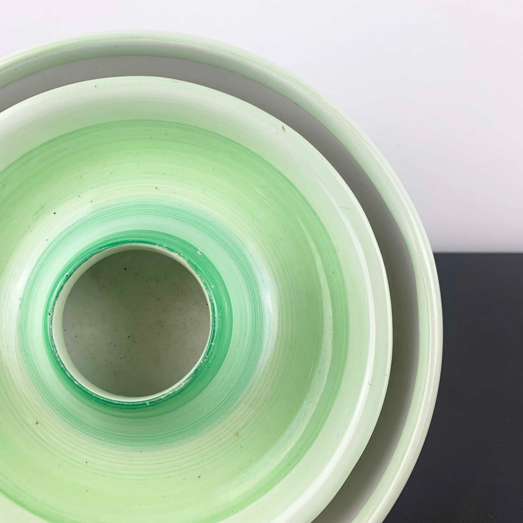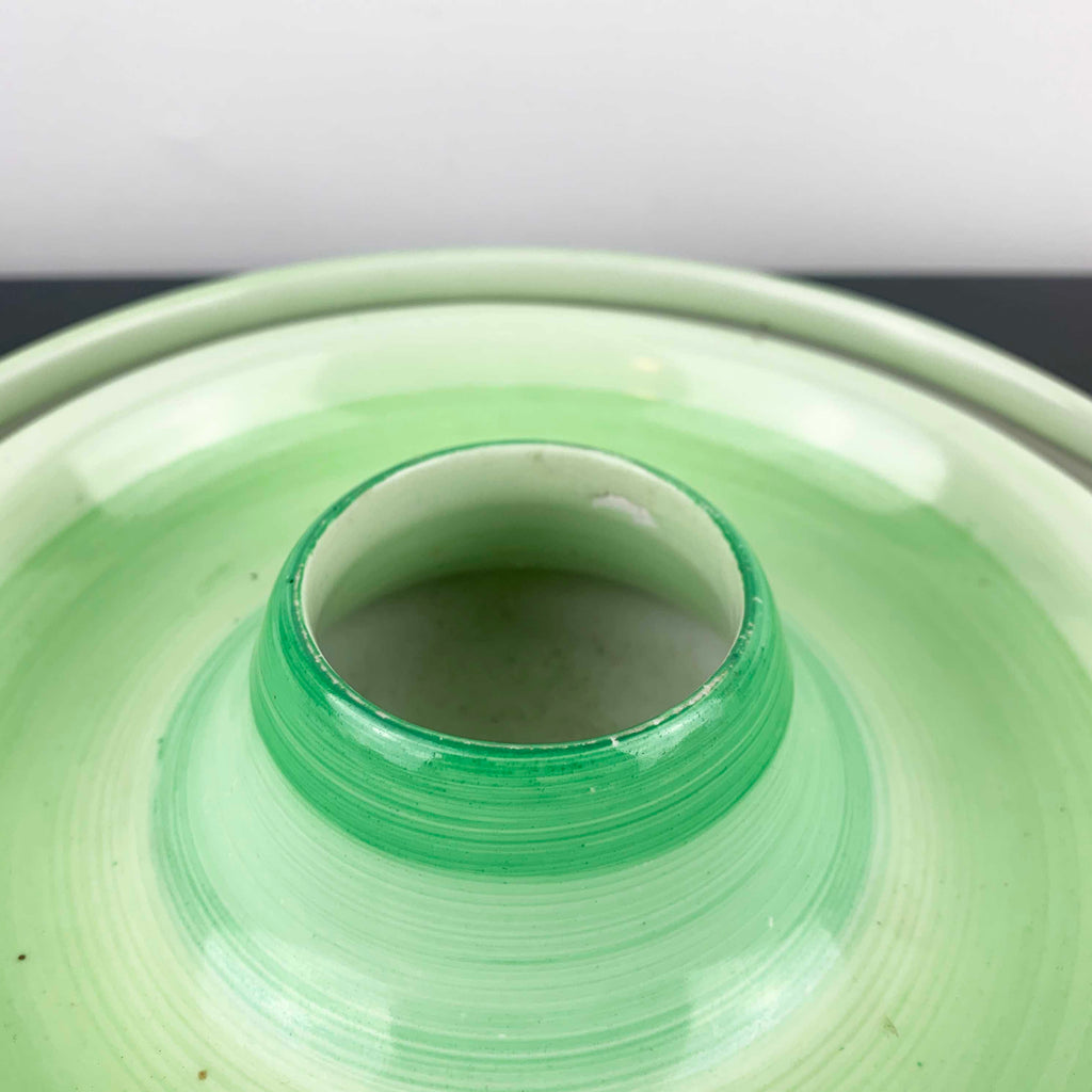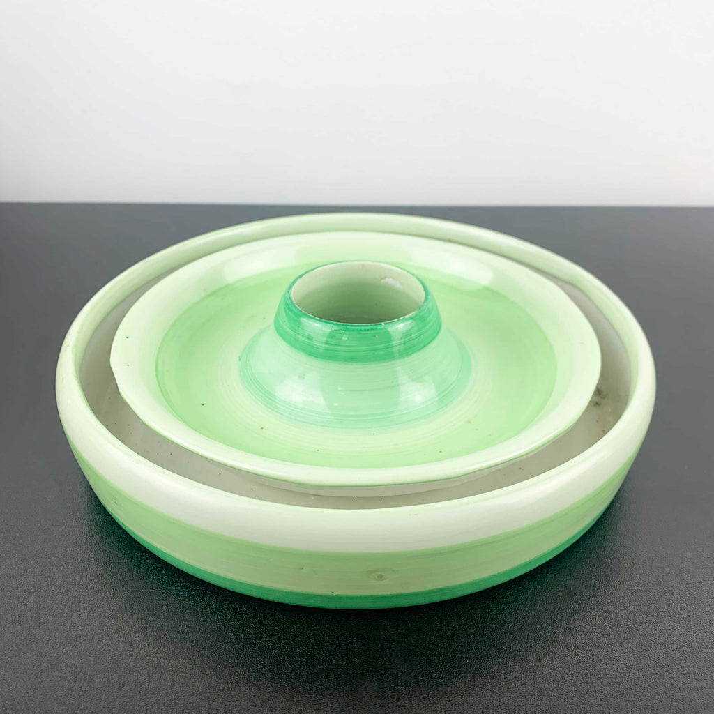 A beautiful green ombre design, the flower float bowl is one piece, a shallow bottom bowl for water with centre stem and shallow flower holder. A beautiful table centrepiece or entrance table display for flowers. Highly collectible art deco pottery piece.