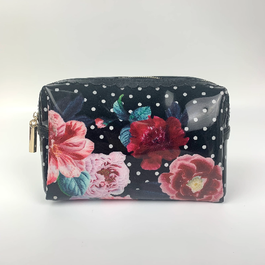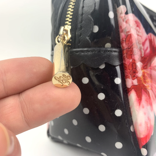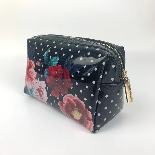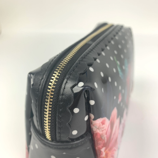This is a very cute and beautiful quality cosmetic or toiletries purse, fully lined with branded interior label on the interior side pocket, heavy duty zipper with branded zipper pull. Frill detail along top zipper opening. Exterior is PVC and easy to clean. Fantastic condition.