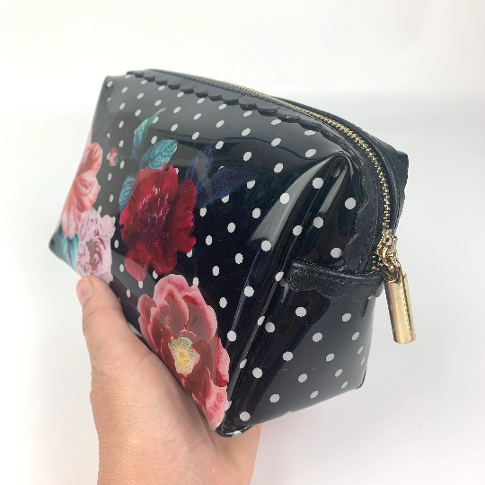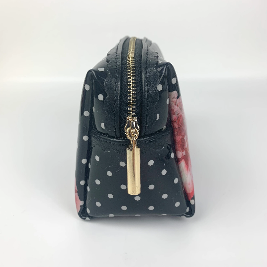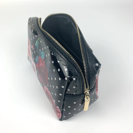 Vintage Alannah Hill Design cosmetic purse, black with white polka dots and red and pink roses. This is iconic Alannah Hill (Australia) design, very feminine cosmetic pouch named 'Treasures of Life'.