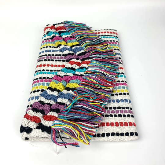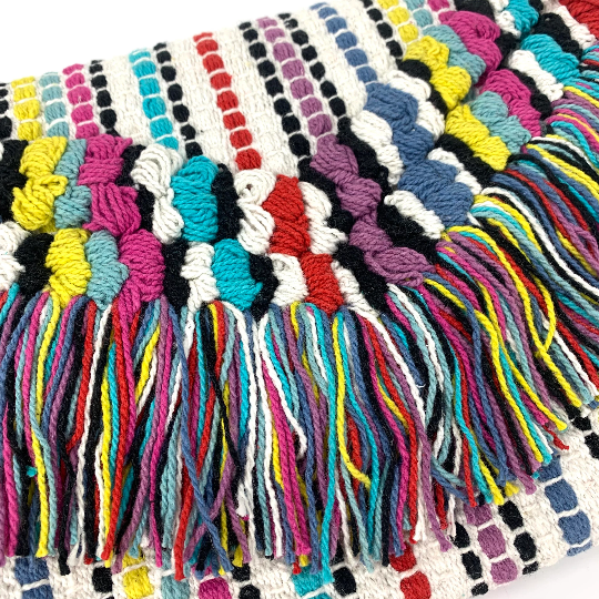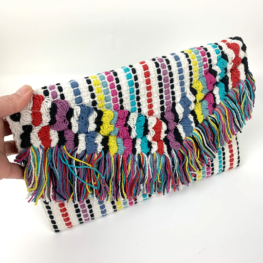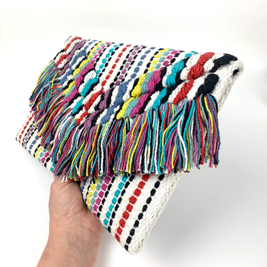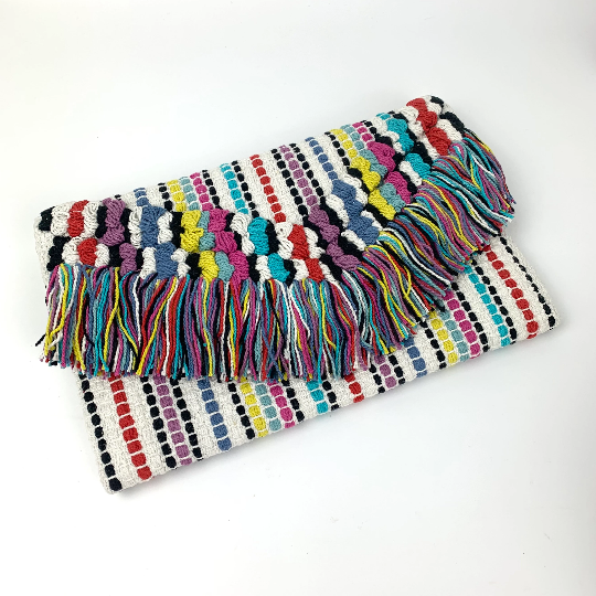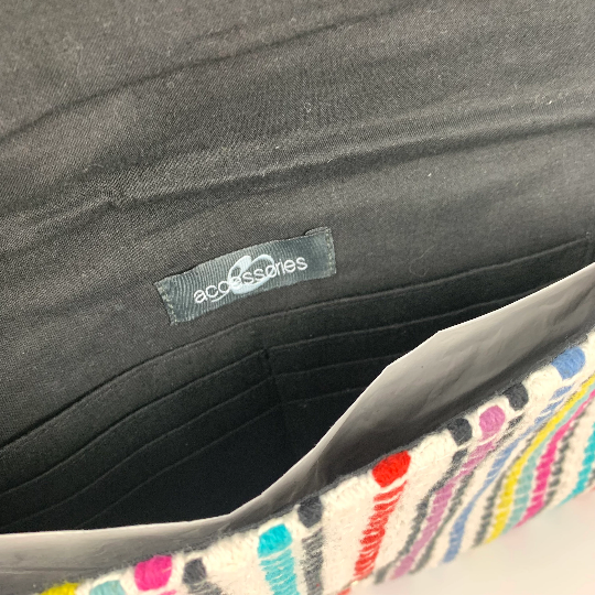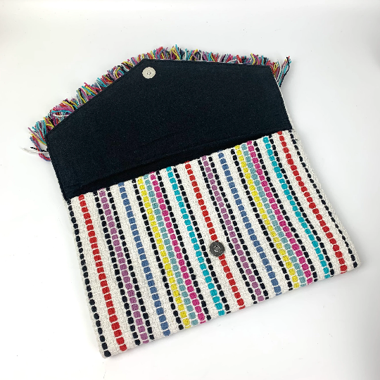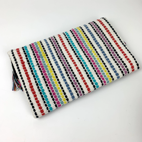Unique vintage embroidered white cotton clutch with multi coloured stripes.