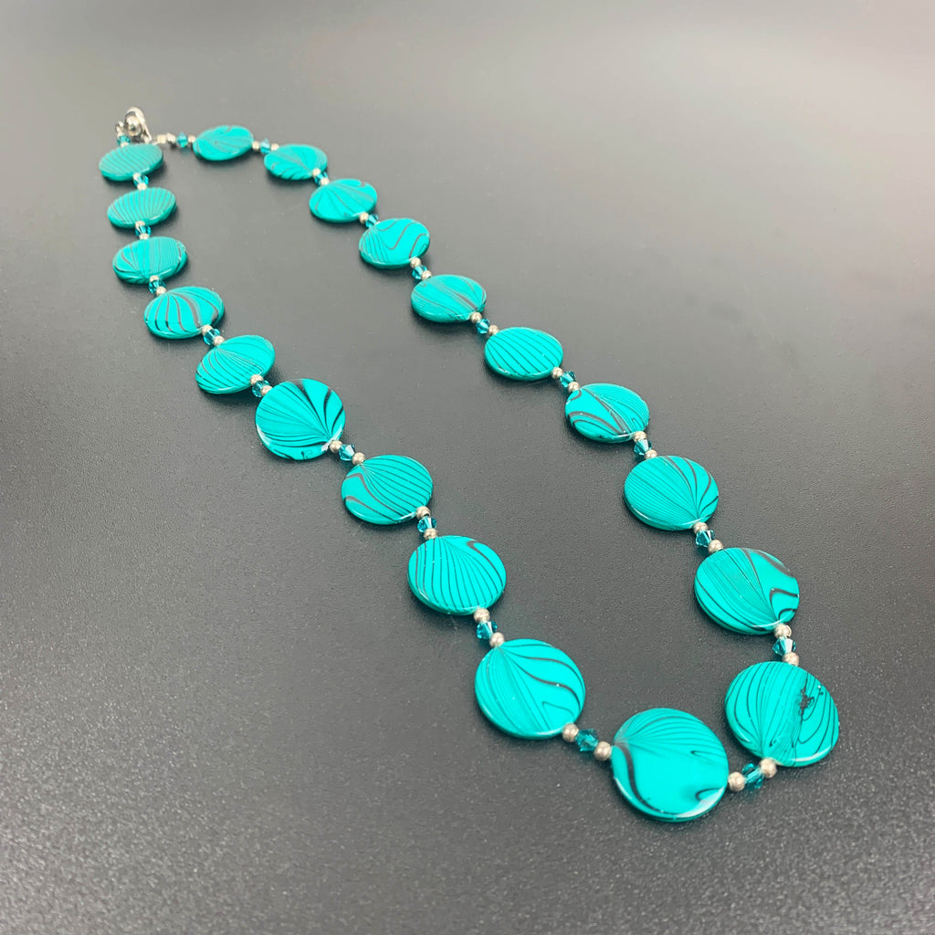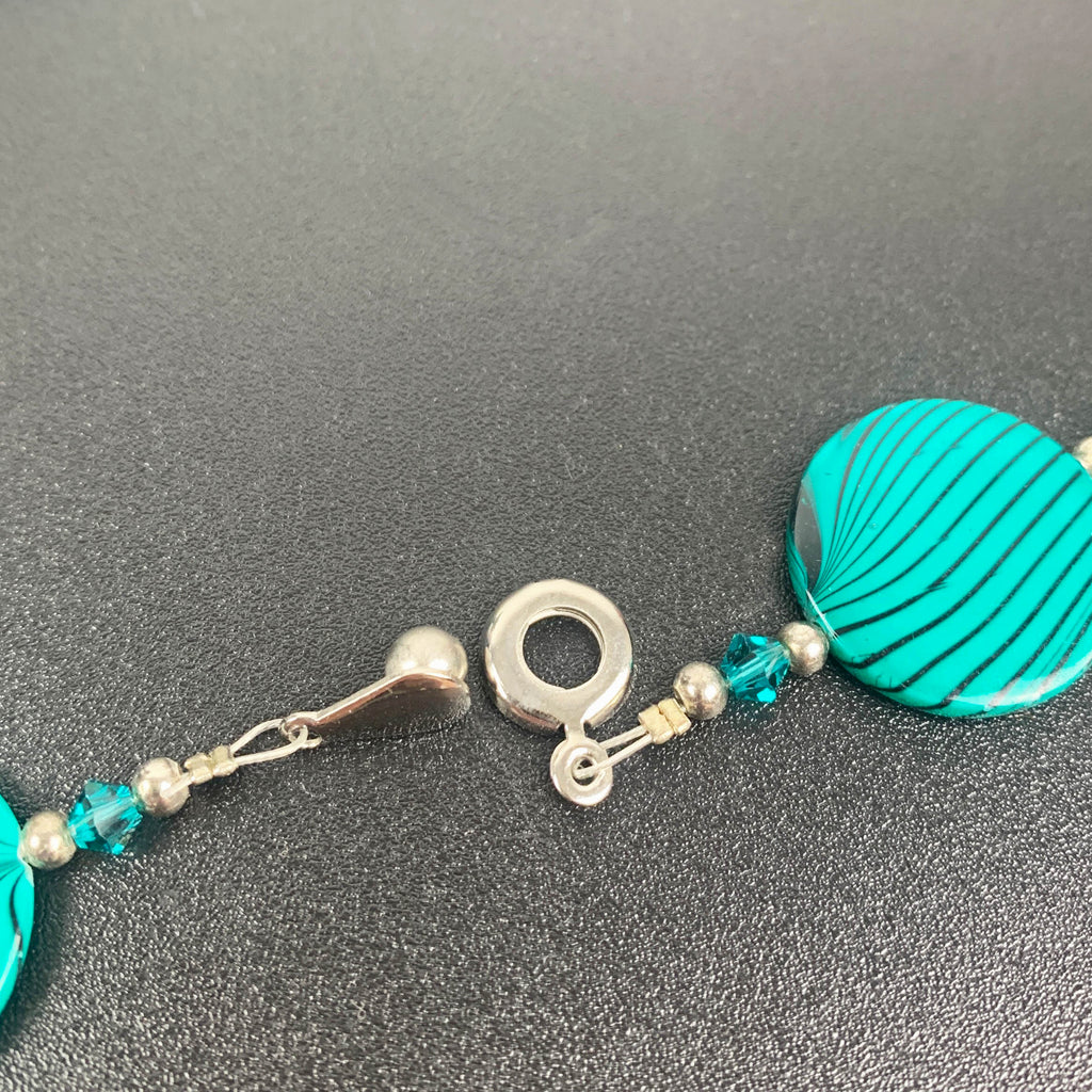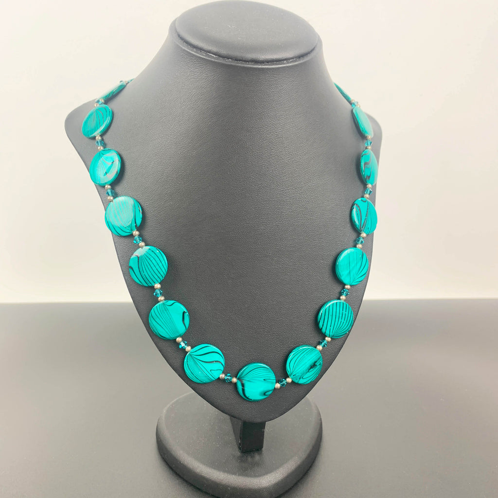 This has a bright summery feel to it and would look stunning with a deep plunge neckline top or dress. Beautiful flat beads with each of them having a black stripe and swirl element, they appear to be resin possibly. Each flat bead joined between 2 small round silver beads and diamond shaped small aqua bead. The clasp is a ball and loop style as shown.