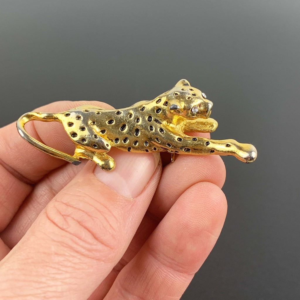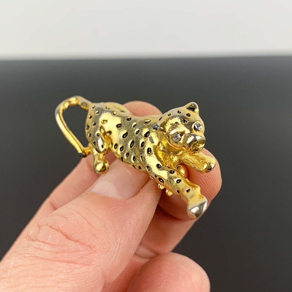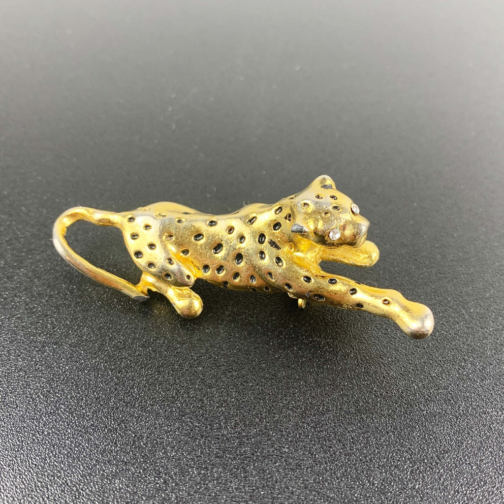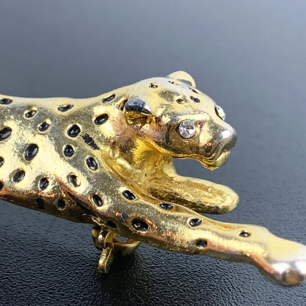Vintage gold toned leopard brooch with black enamel spots and clear rhinestone eyes.