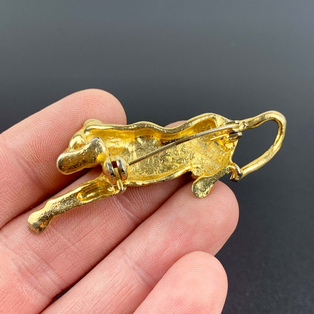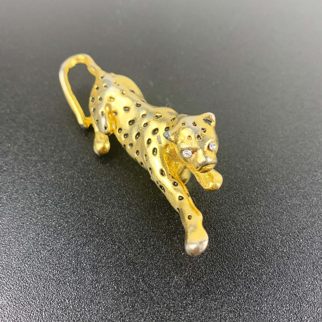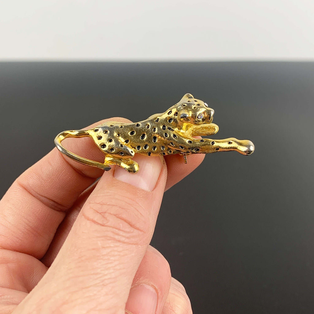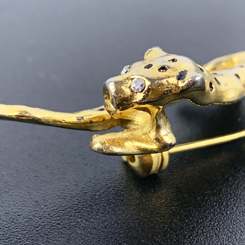 Vintage gold toned leopard brooch with black enamel spots and clear rhinestone eyes.