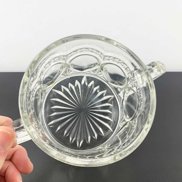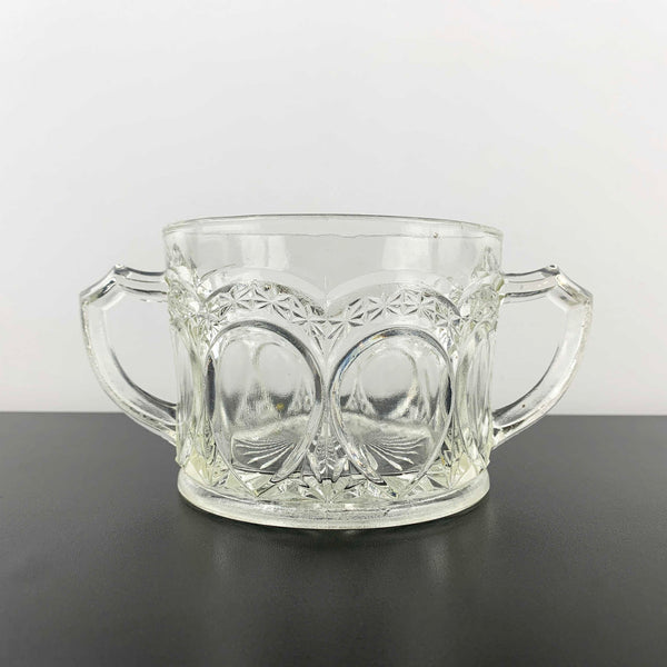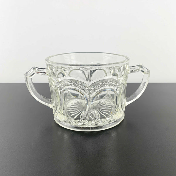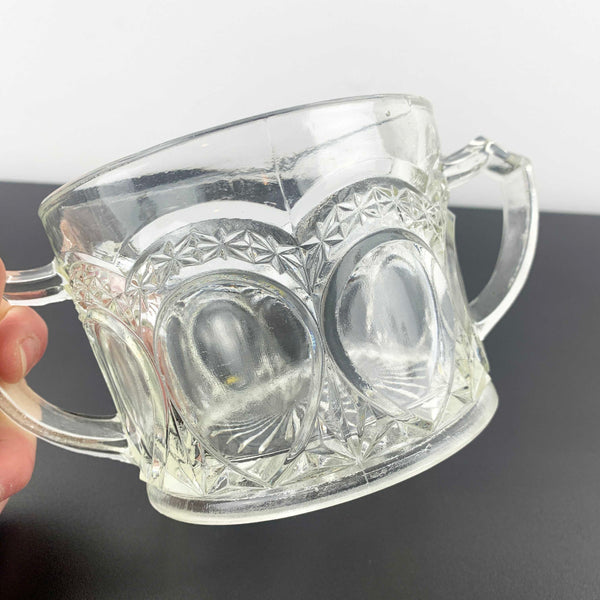 A pressed glass twin handled sugar bowl with a star and teardrop pattern by Crown Crystal, Australia. Circa 1920's/30's, pattern first introduced in 1926.