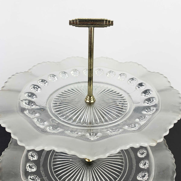 A combination of frosted and clear pressed glass, this piece has 2 tiers for a high tea or tea party setting for cakes and sweets. Pressed decorative detail to the perimeter of each plate, the 'blackberry prunt' design, with a pretty ruffled plate edge. Wonderful art deco style handle in a gold toned metal, which is tarnished from age.