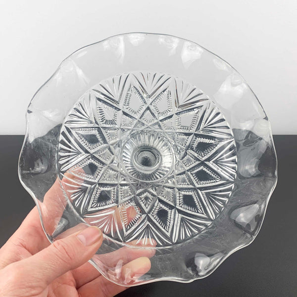 Beautiful example of English pressed glass, this small compote can be used for many purposes such as a dessert and candy bowl. Made by George Davidson & Co, England, circa 1897.