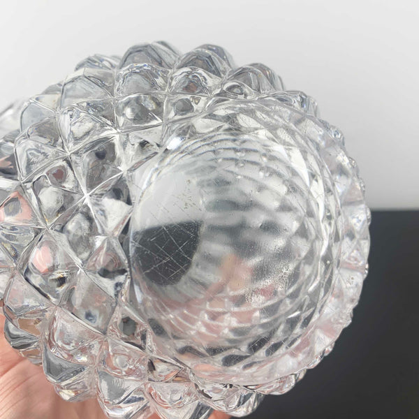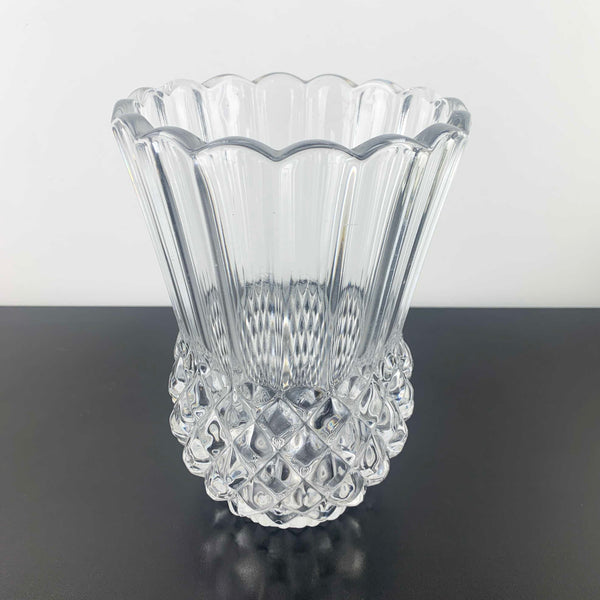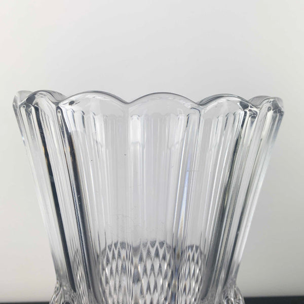 This pattern features an intricate diamond design to the bottom bowl, the faceted finish catches the light beautifully, opening up with fluted sides and scalloped rim.