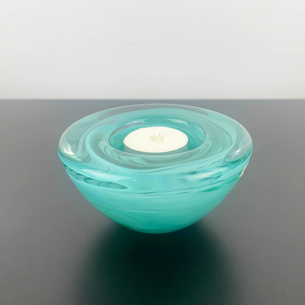 This piece can be used as a votive or tea light candle holder, also as a paper weight or stylish home decor item. The swirl pattern, combined with the beautiful aqua colour creates a stunning glass item.