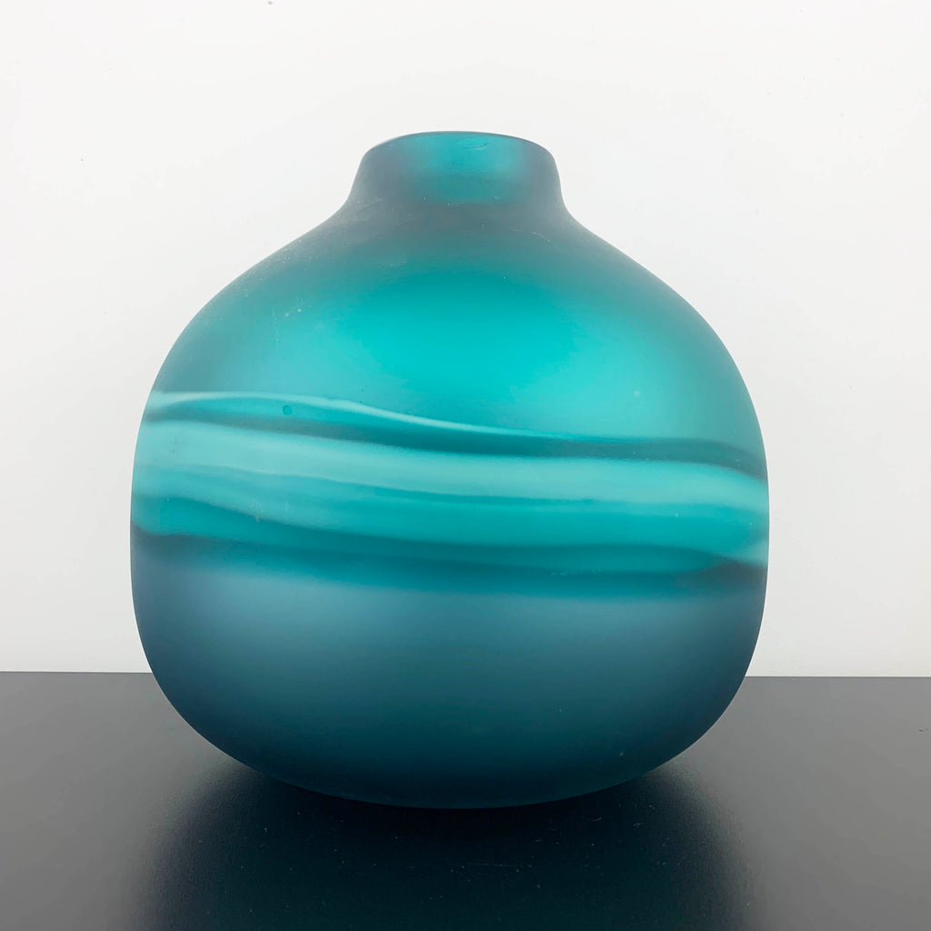 This vase is a beautiful art glass example, a very heavy and large centrepiece bulb style vase. It has a frosted finish glass with a central ombre style swirl pattern, reminiscent of the sea or beach with it's design and gorgeous colours.