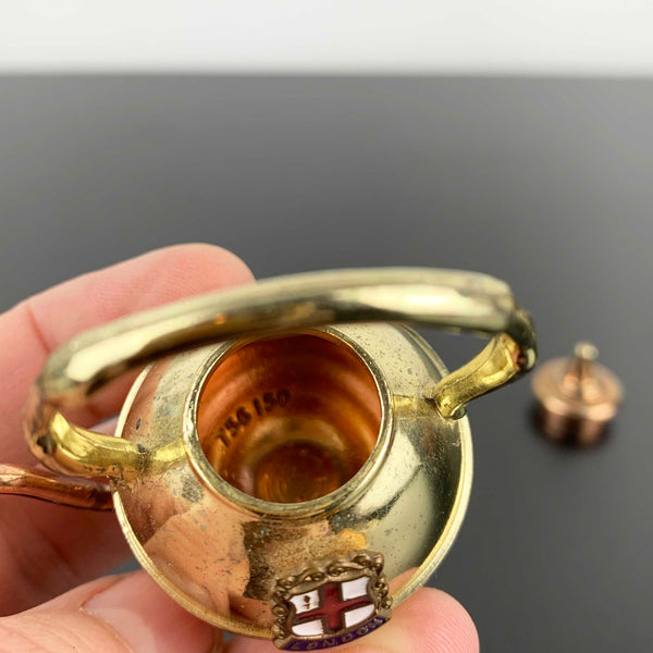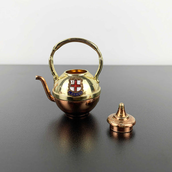 This baby teapot appears to be brass and copper, and features an emblem with 'London' and the St George cross on the front. Note that this is not a dollhouse miniature.