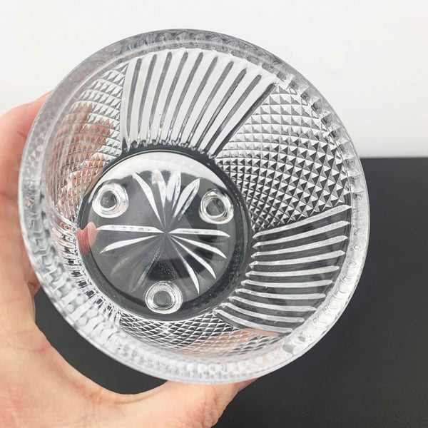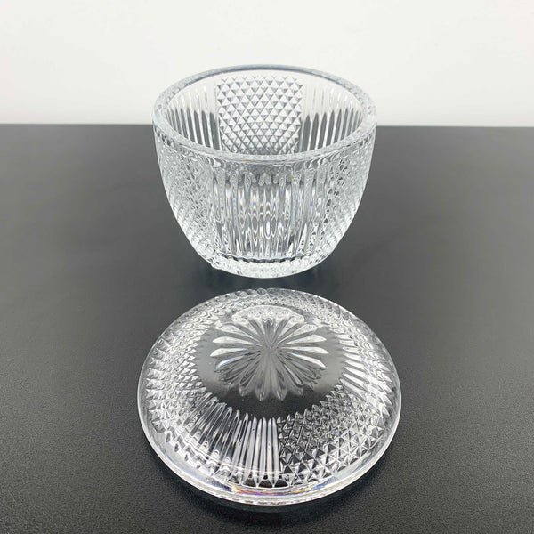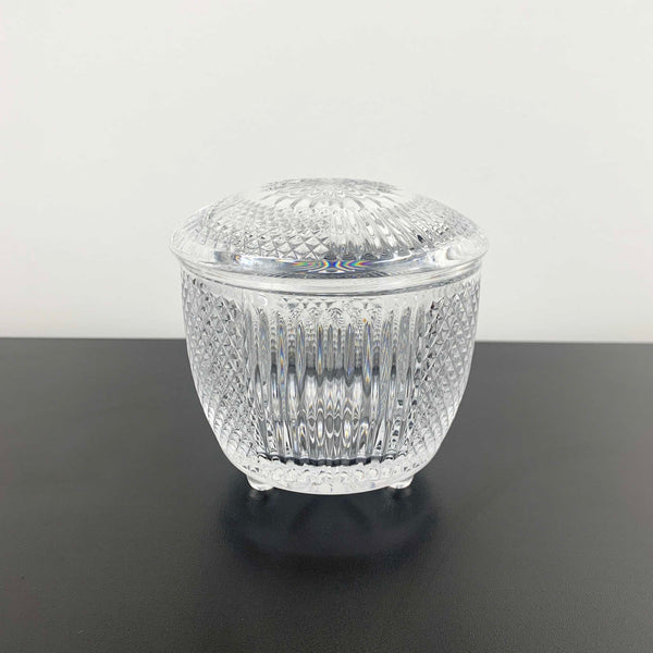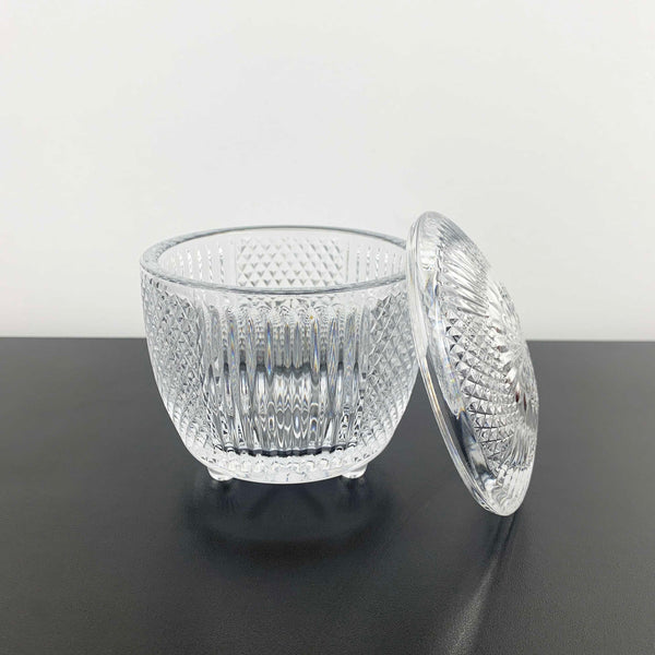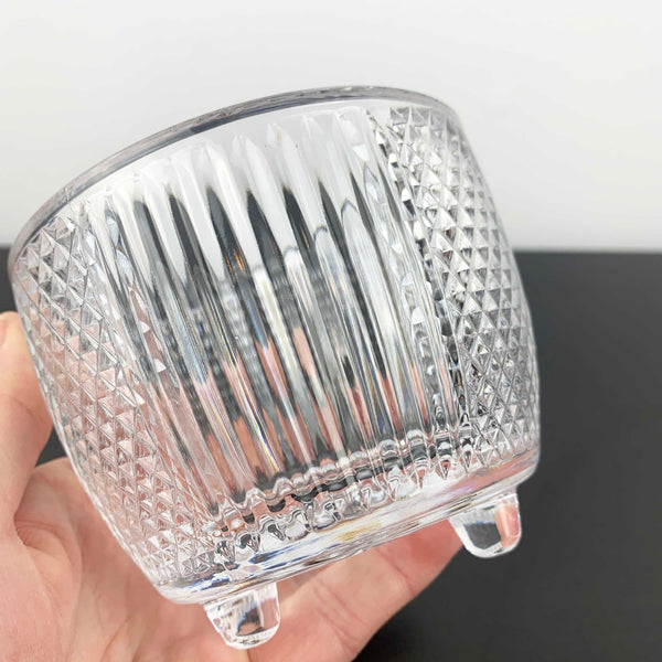 Features a beautiful alternating pattern around the bowl exterior of intricate diamonds and stripes, the pattern follows through to the matching lid and it has three little glass feet.