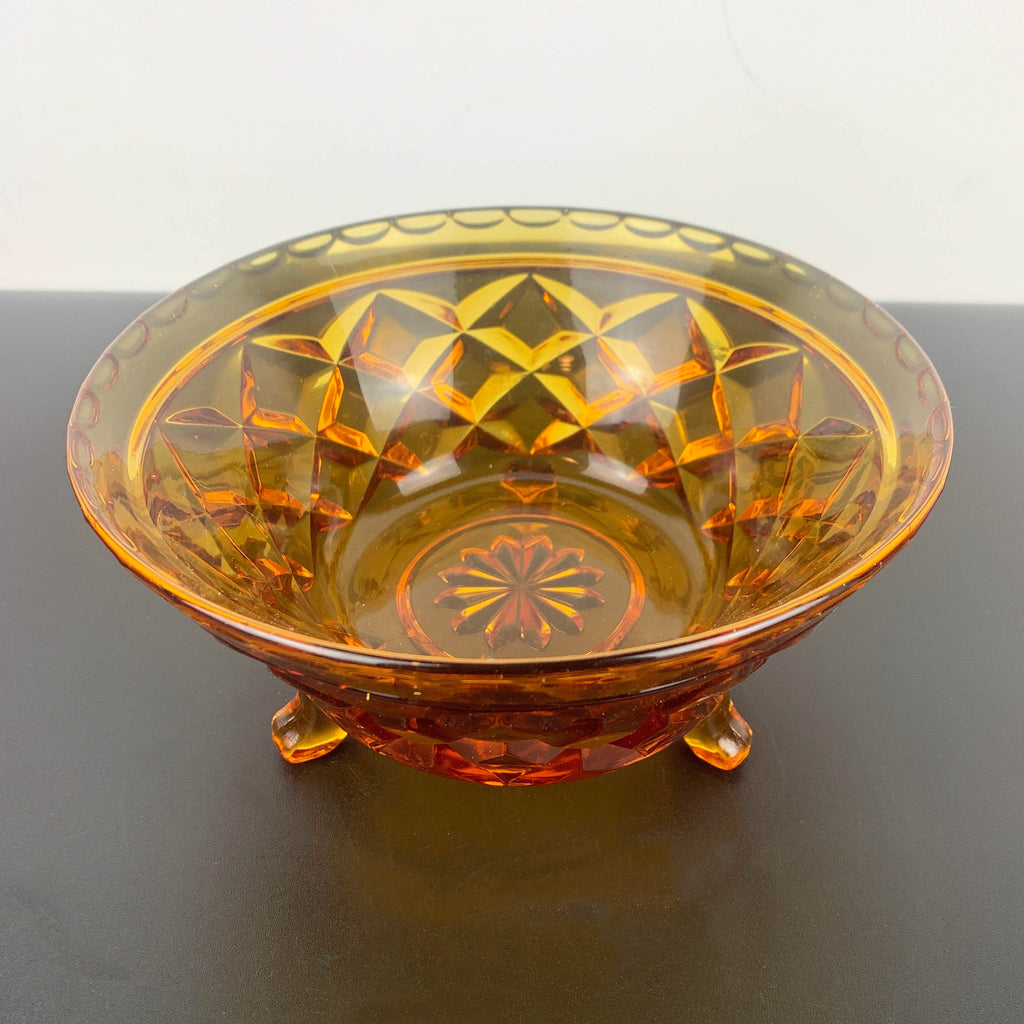 This is a beautiful traditional diamond cut tri foot bowl in amber glass.