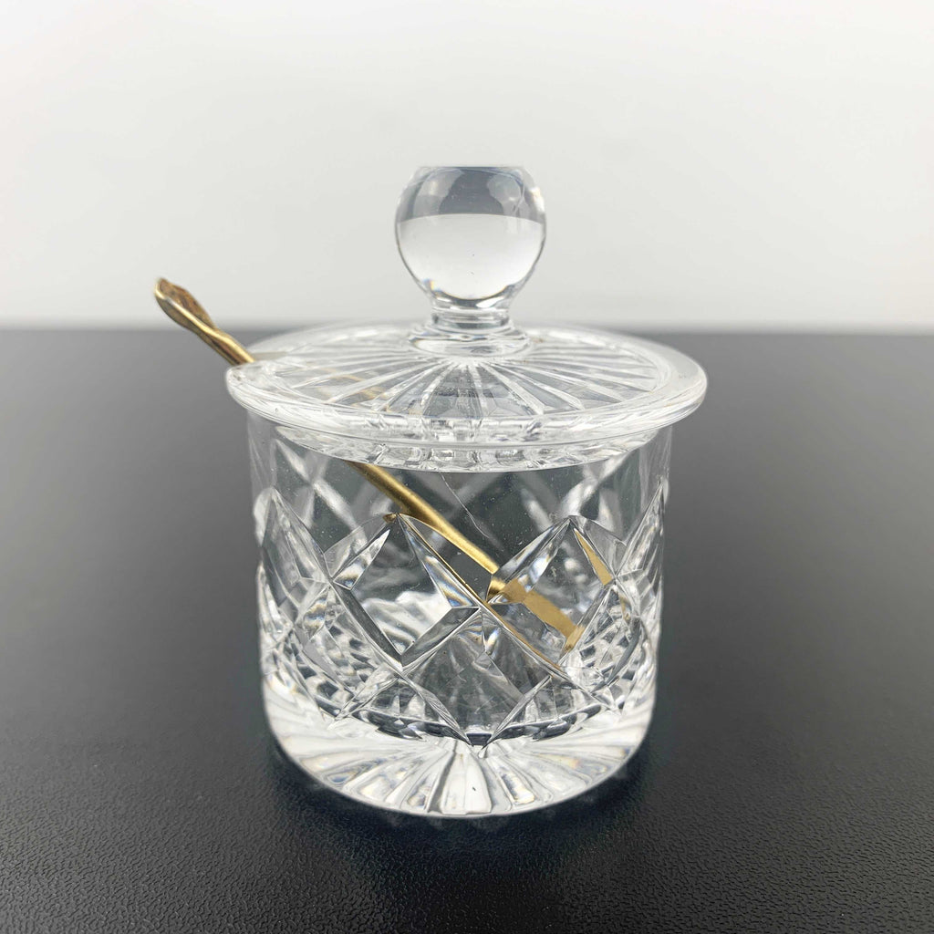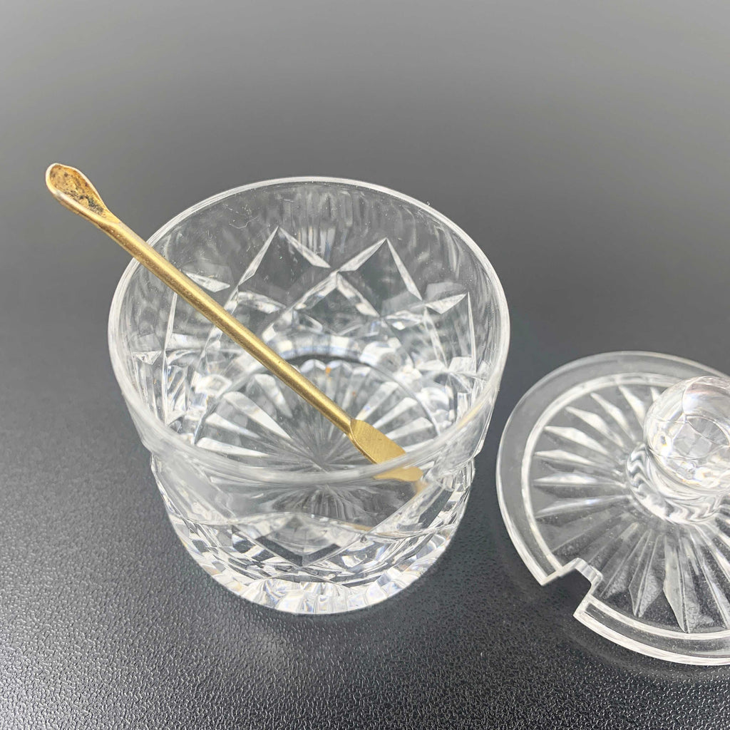Mini diamond cut crystal mustard and condiment pot with gold shovel