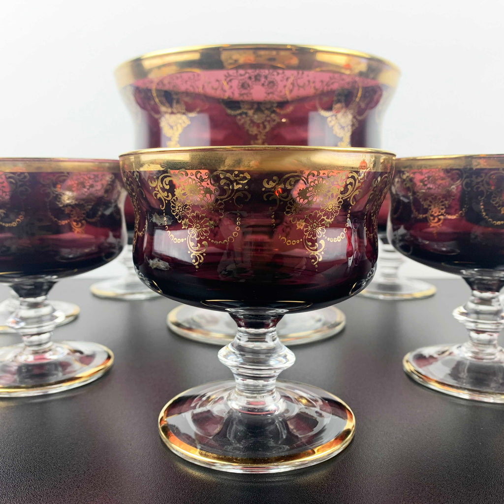 Murano 8 piece amethyst glass dessert bowl set with gold gilt detail