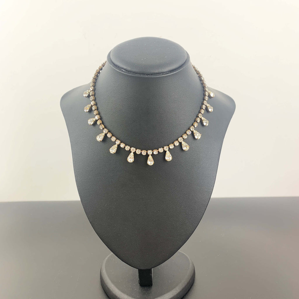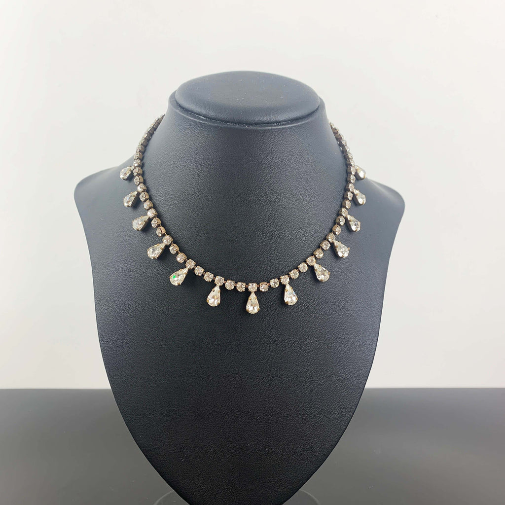 A glamorous vintage rhinestone evening necklace featuring an array of teardrop shaped rhinestones on a chain of round rhinestones.