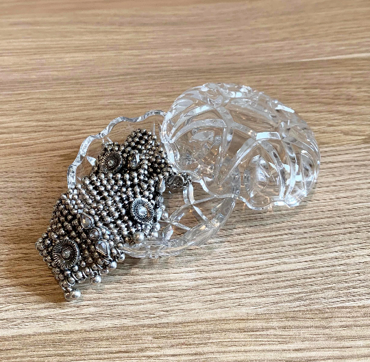 Delicate and gorgeous lidded jewellery holder, waved shaping like a clam shell. For those special small and delicate jewellery items, or those items which are favourites, special and used regularly.